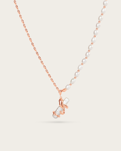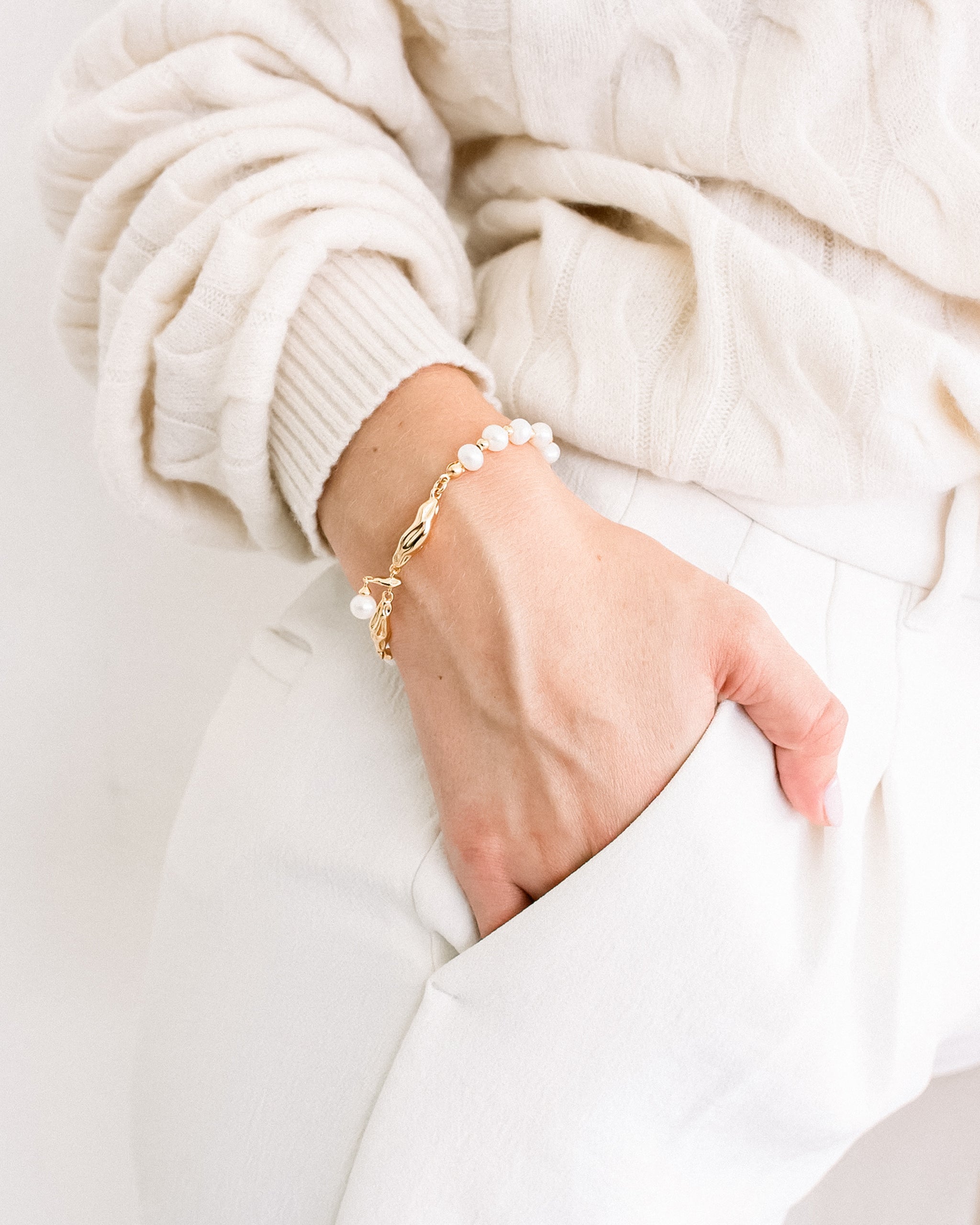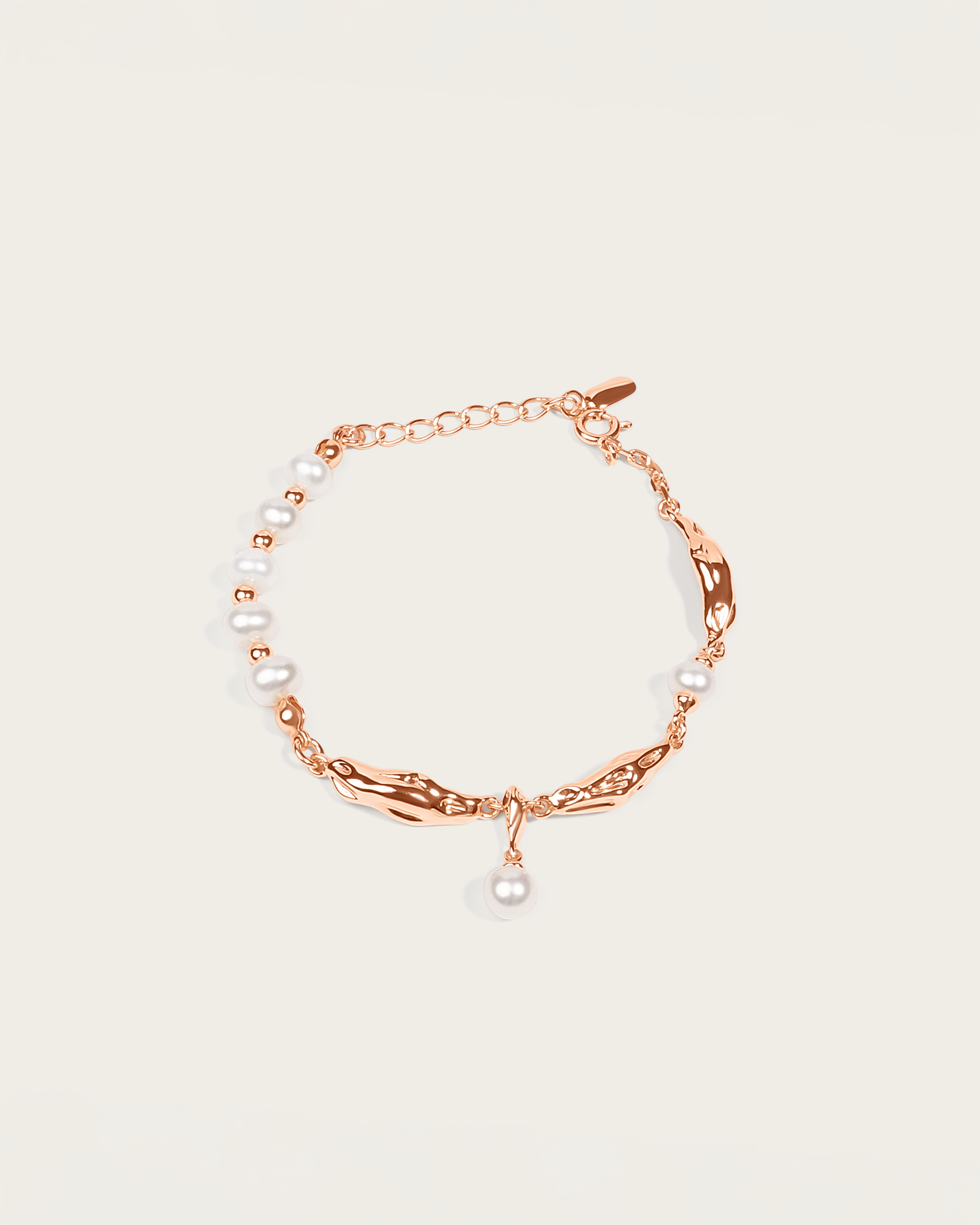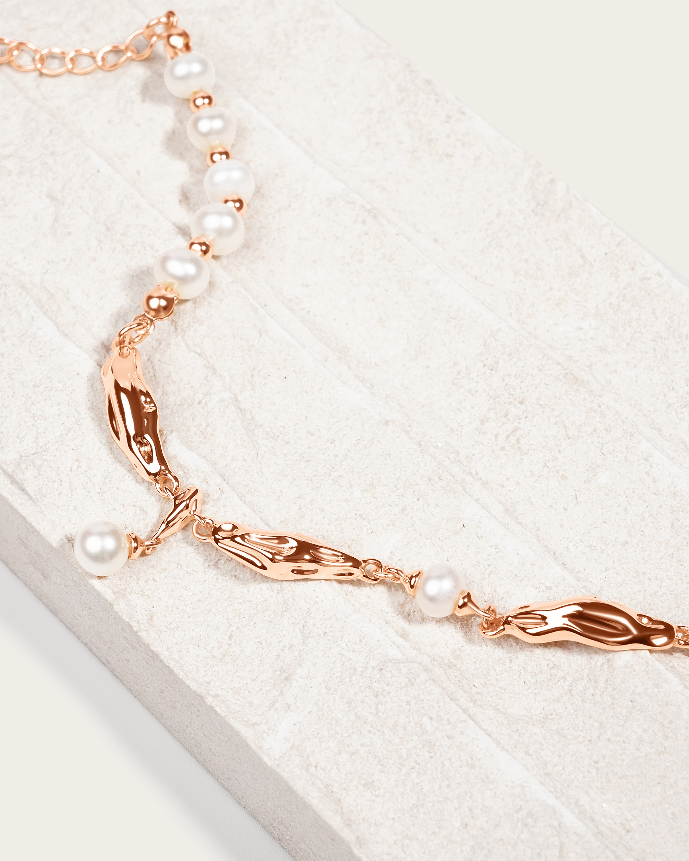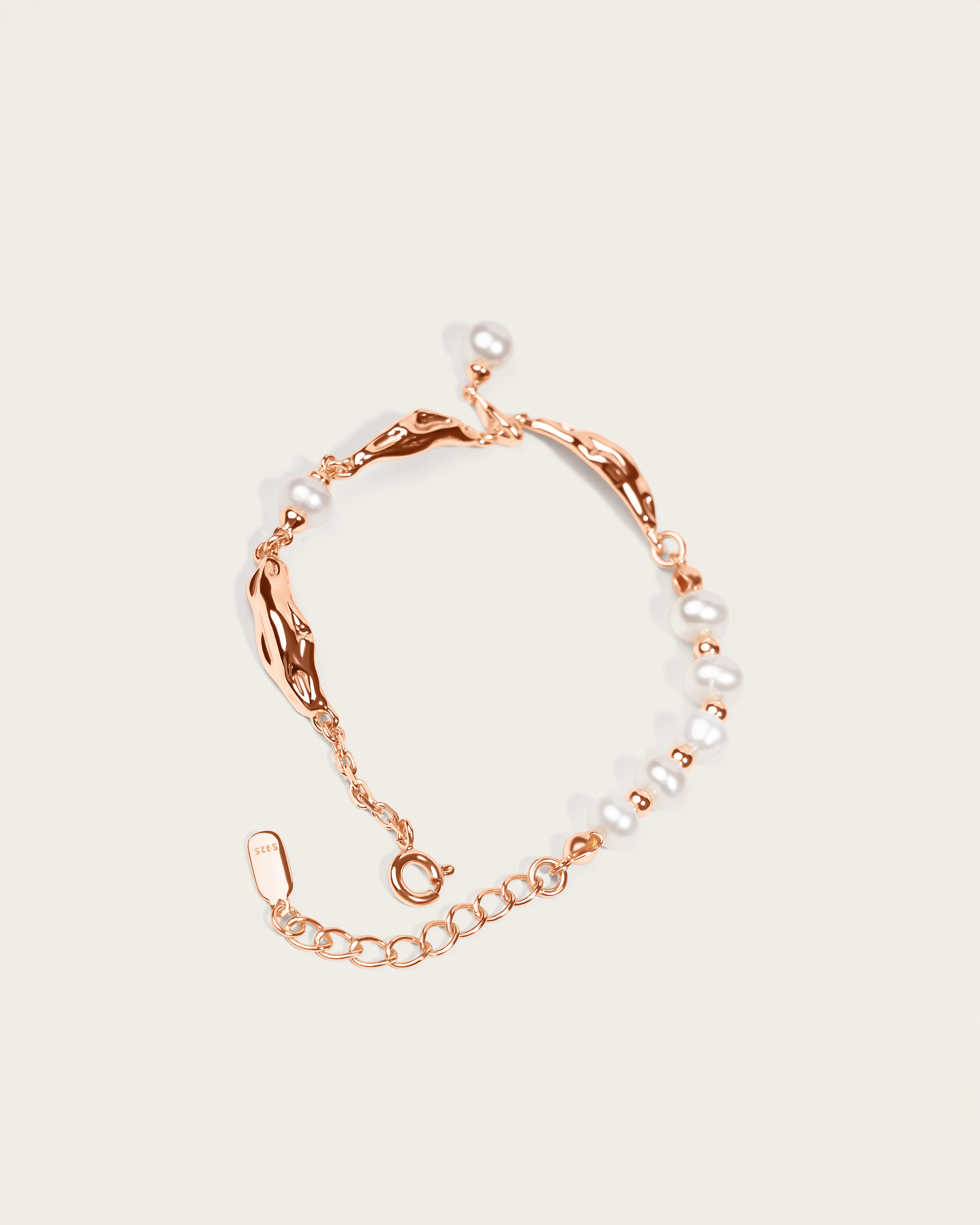 This piece combines freshwater pearls with fluid rose gold vermeil metalwork, merging the structured elegance of a classic pearl bracelet with the organic movement of sculptural design. A contemporary balance of form and flow that defines the Flow collection’s design core.