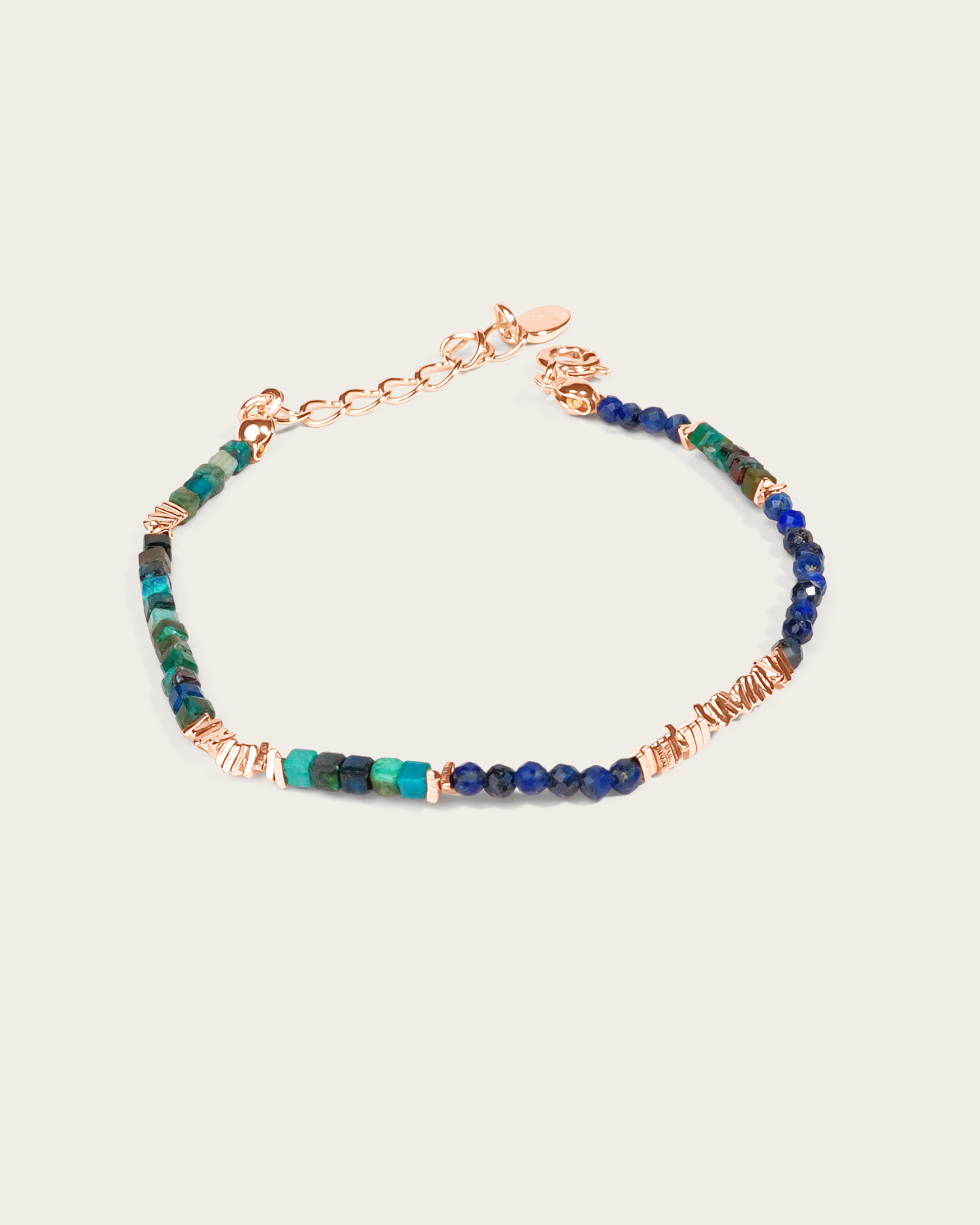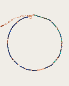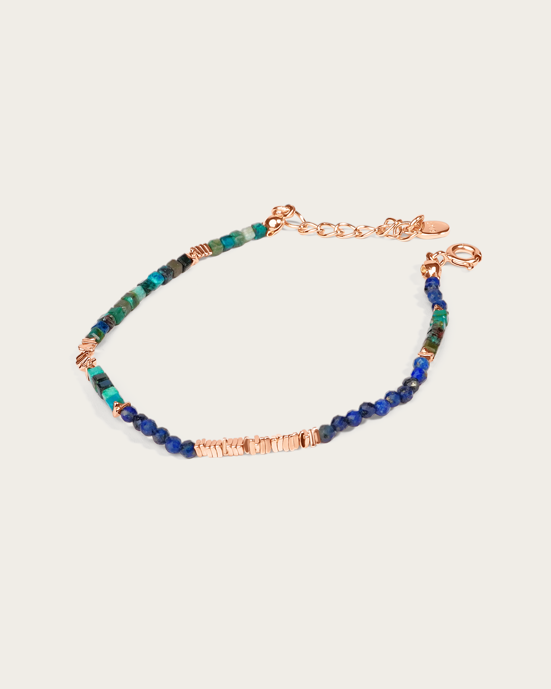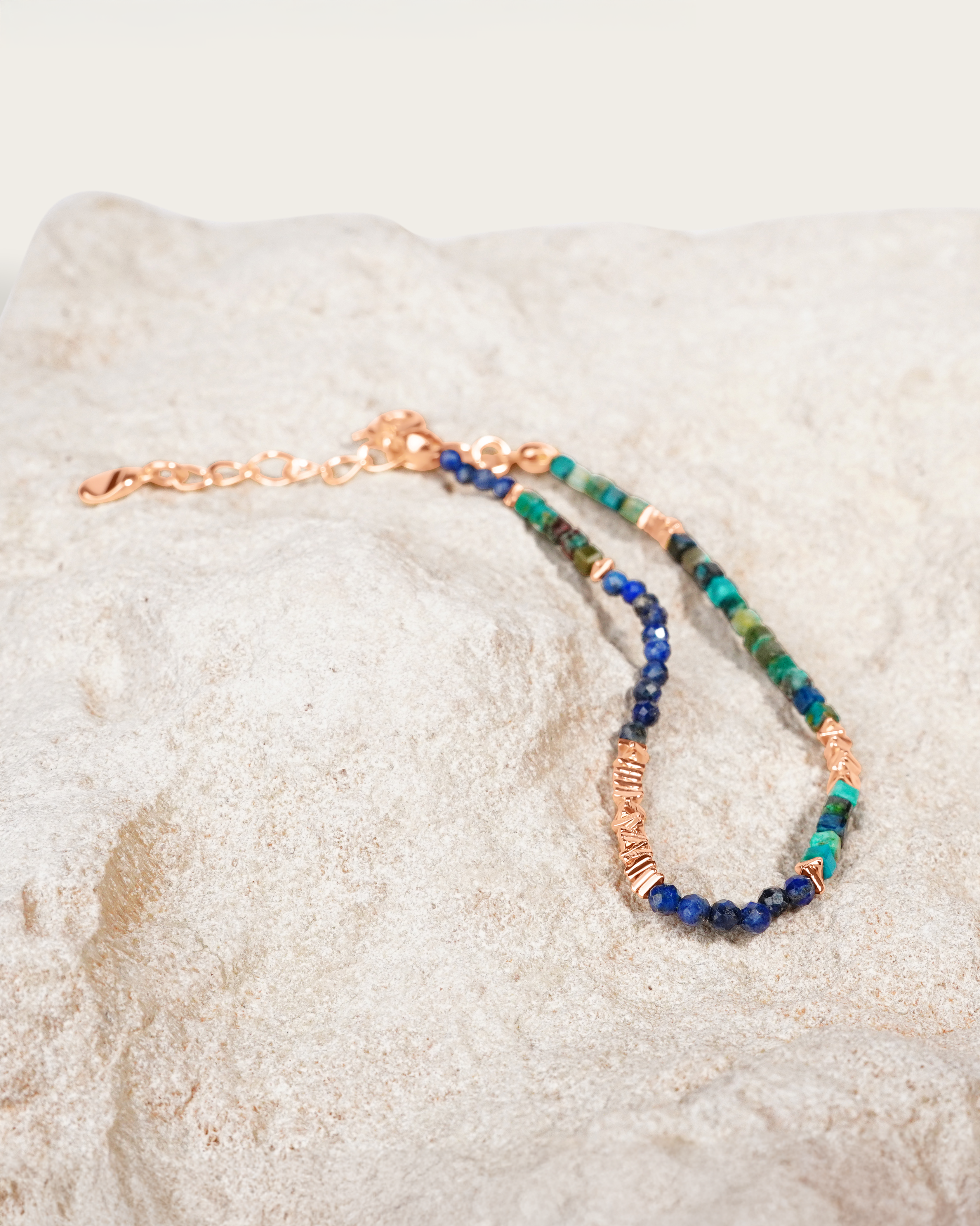 This beaded bracelet features a mix of lapis lazuli, turquoise, and rose gold vermeil beads, blending deep blue and green tones with warm metallic accents.