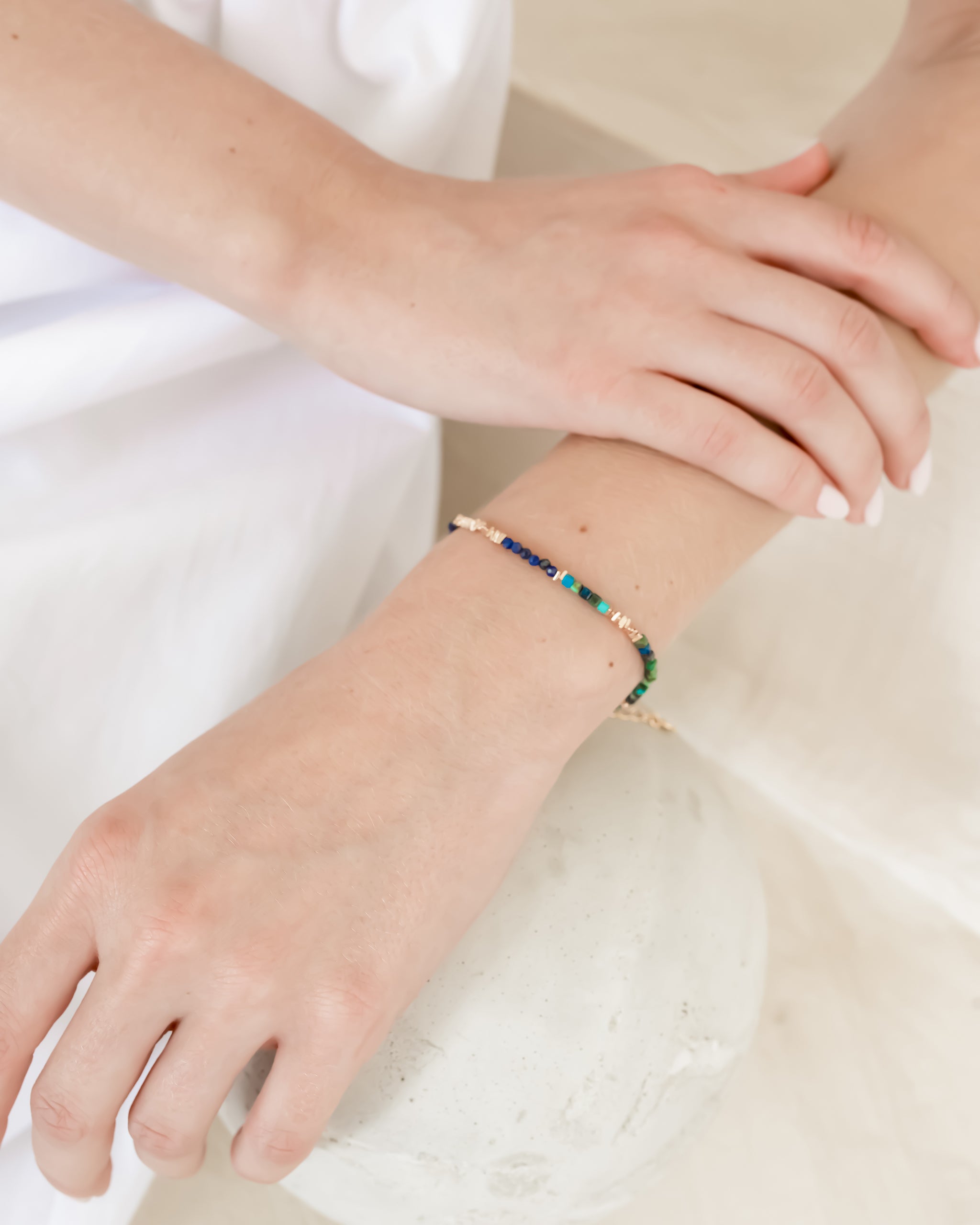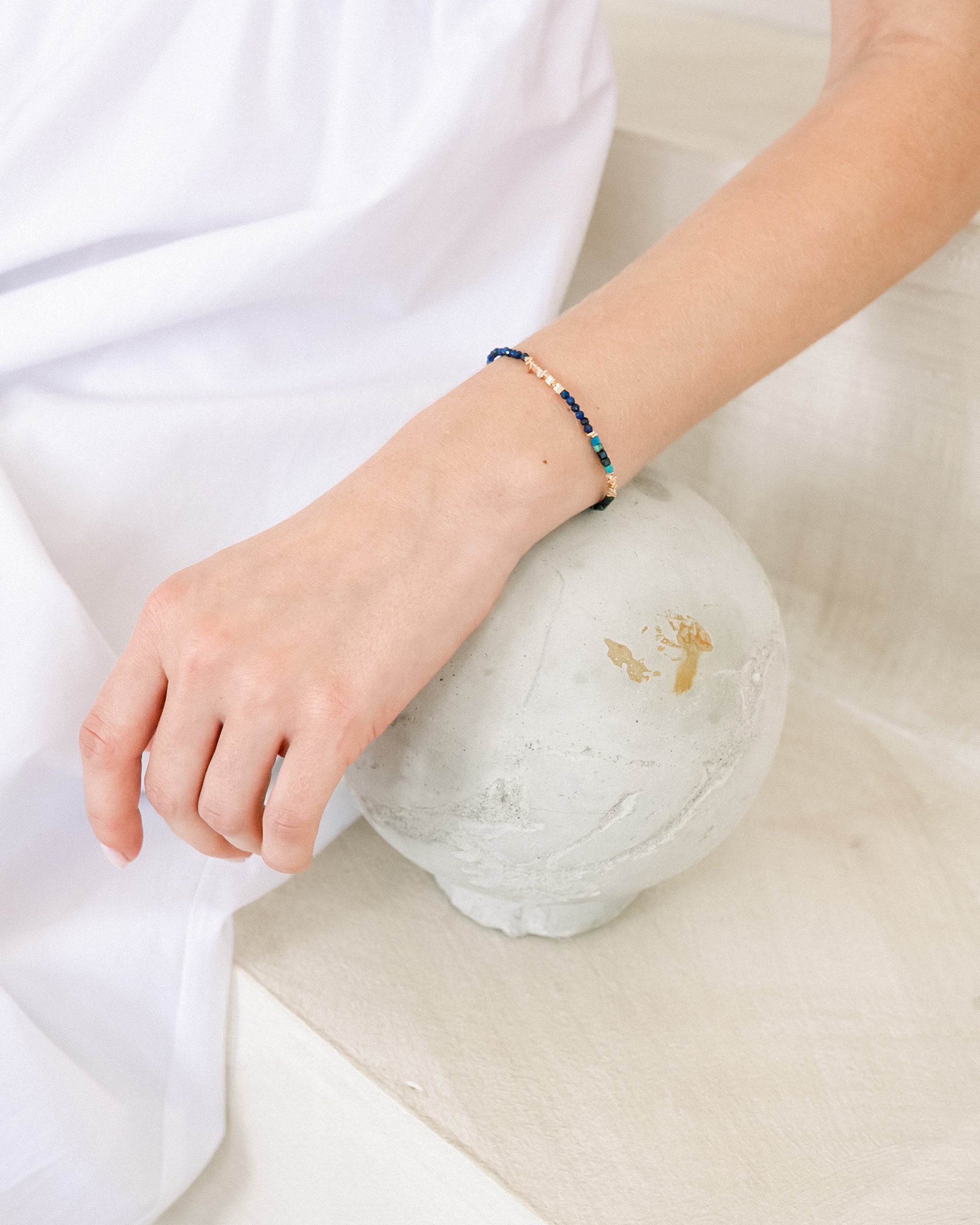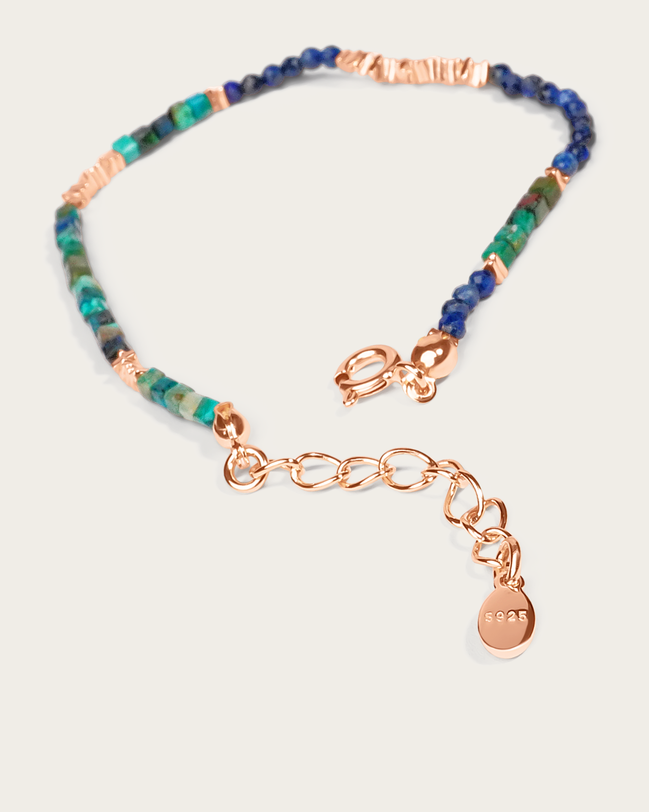 This beaded bracelet features a mix of lapis lazuli, turquoise, and rose gold vermeil beads, blending deep blue and green tones with warm metallic accents.