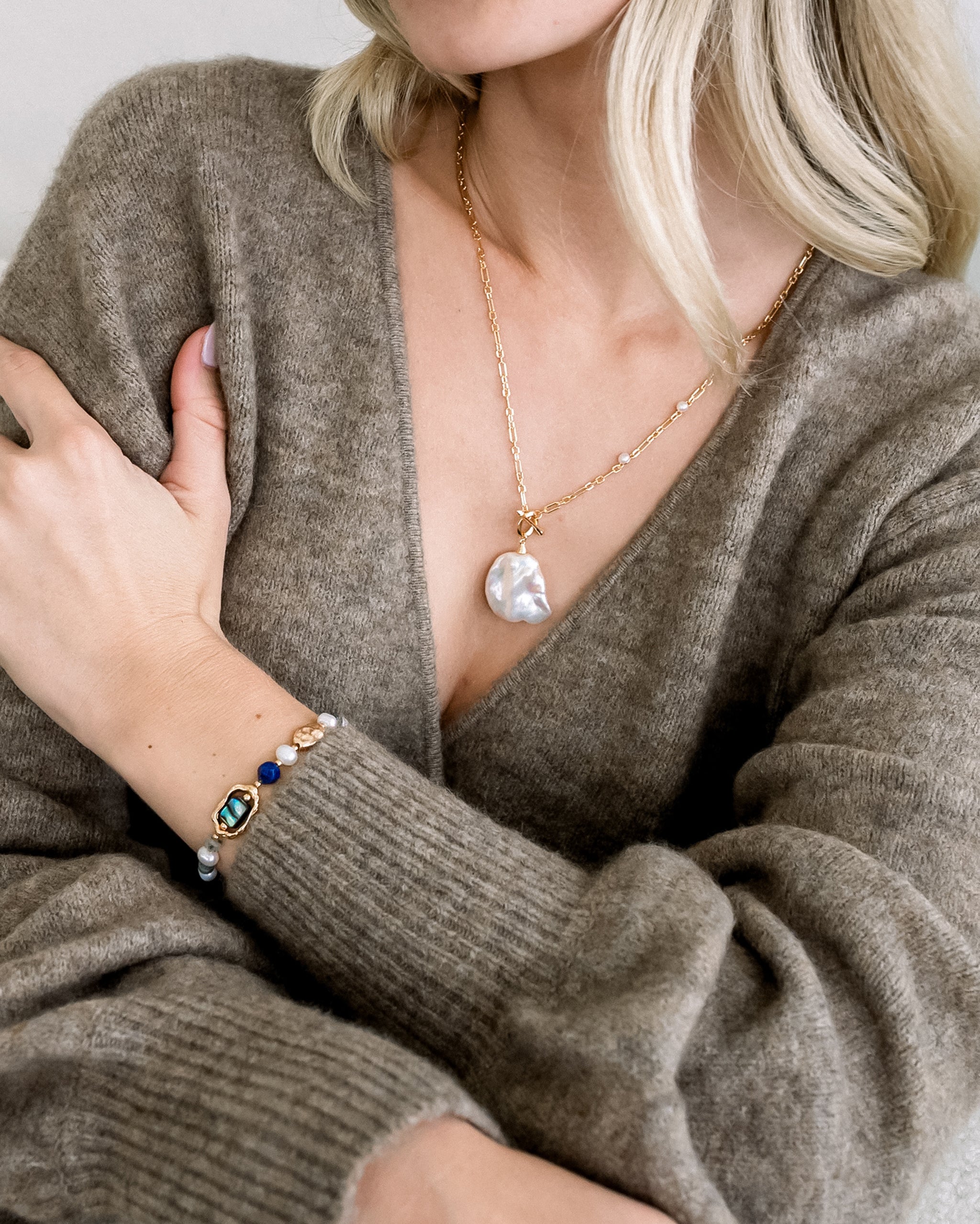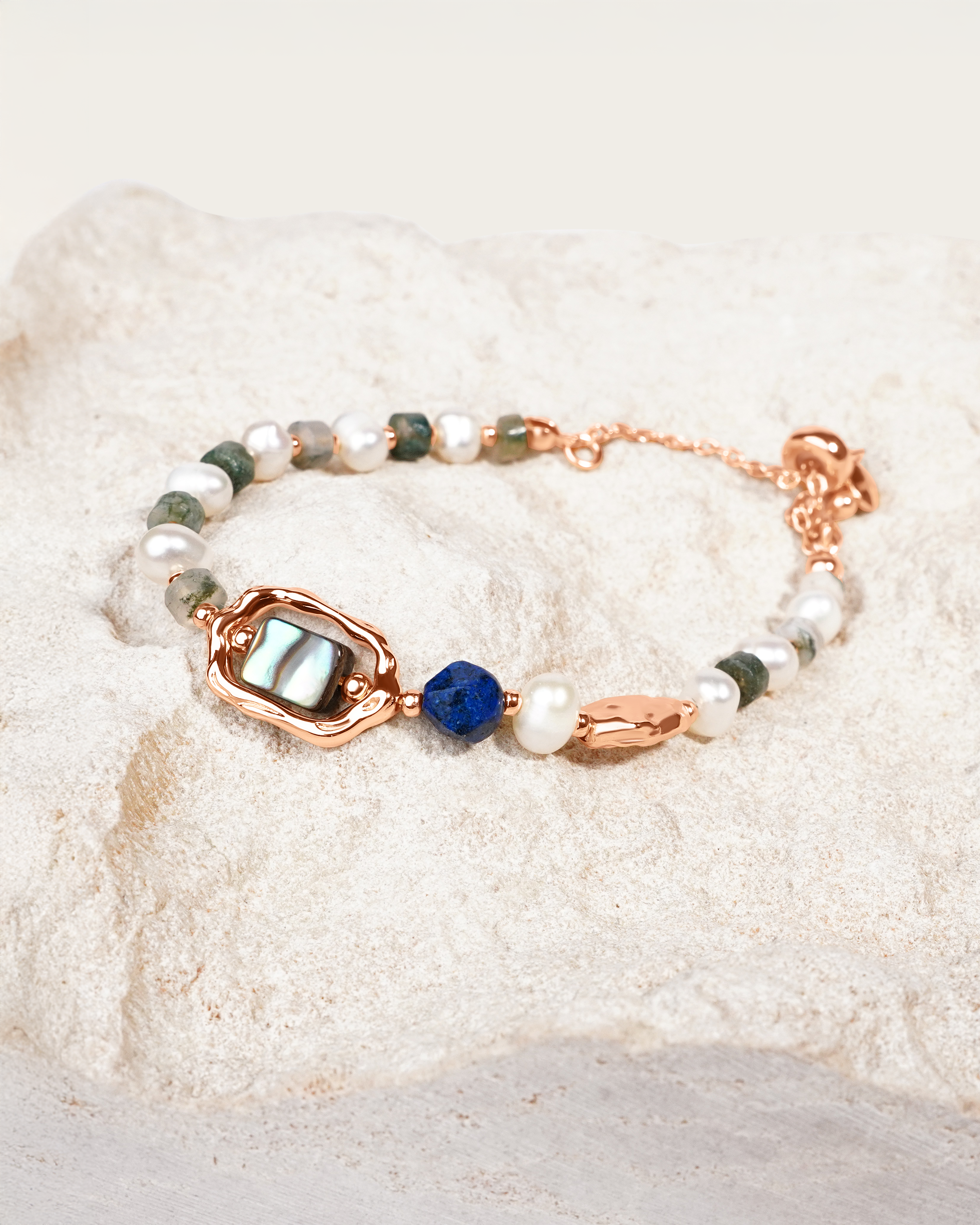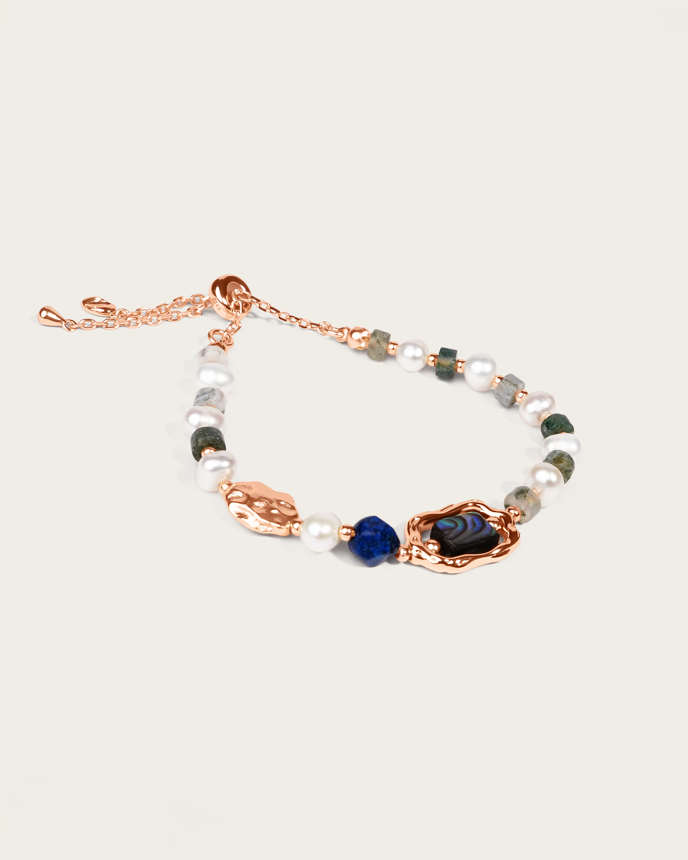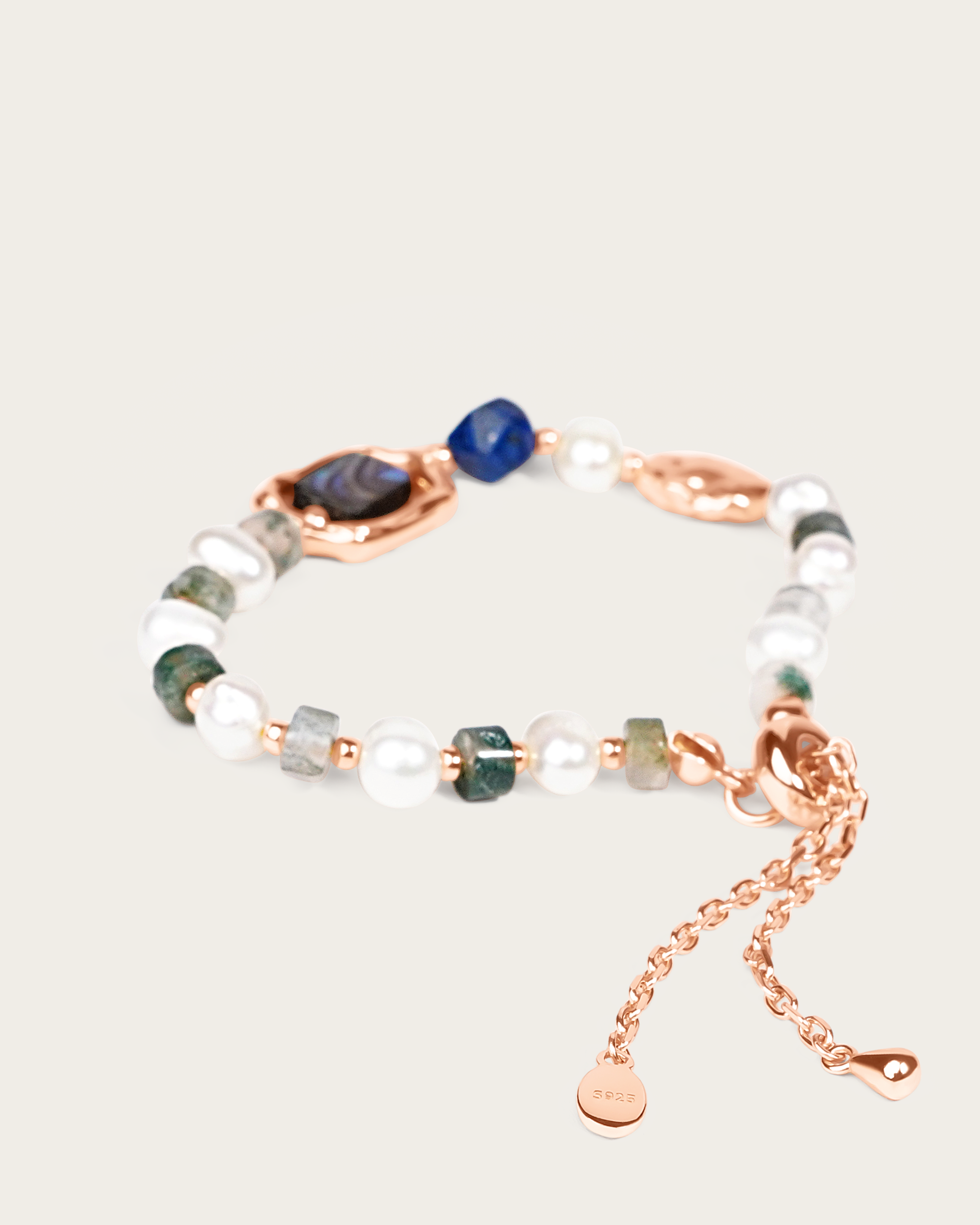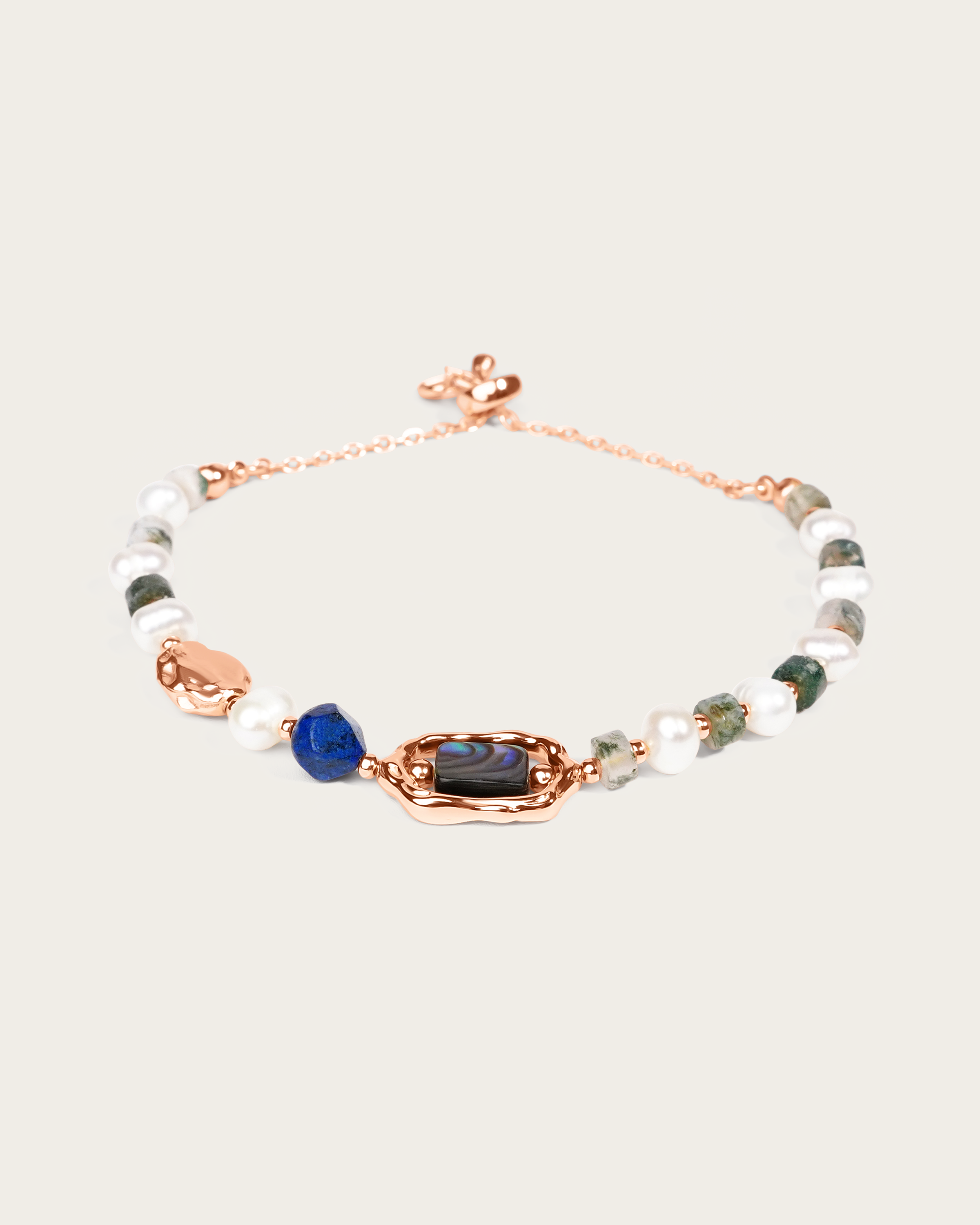 This bracelet features a Pāua shell centerpiece framed in rose gold vermeil metalwork, accented with jade, lapis lazuli, freshwater pearls, and rose gold beads. The mix of materials creates subtle contrast between iridescent, opaque, and metallic tones. Finished with an adjustable bolo closure.
