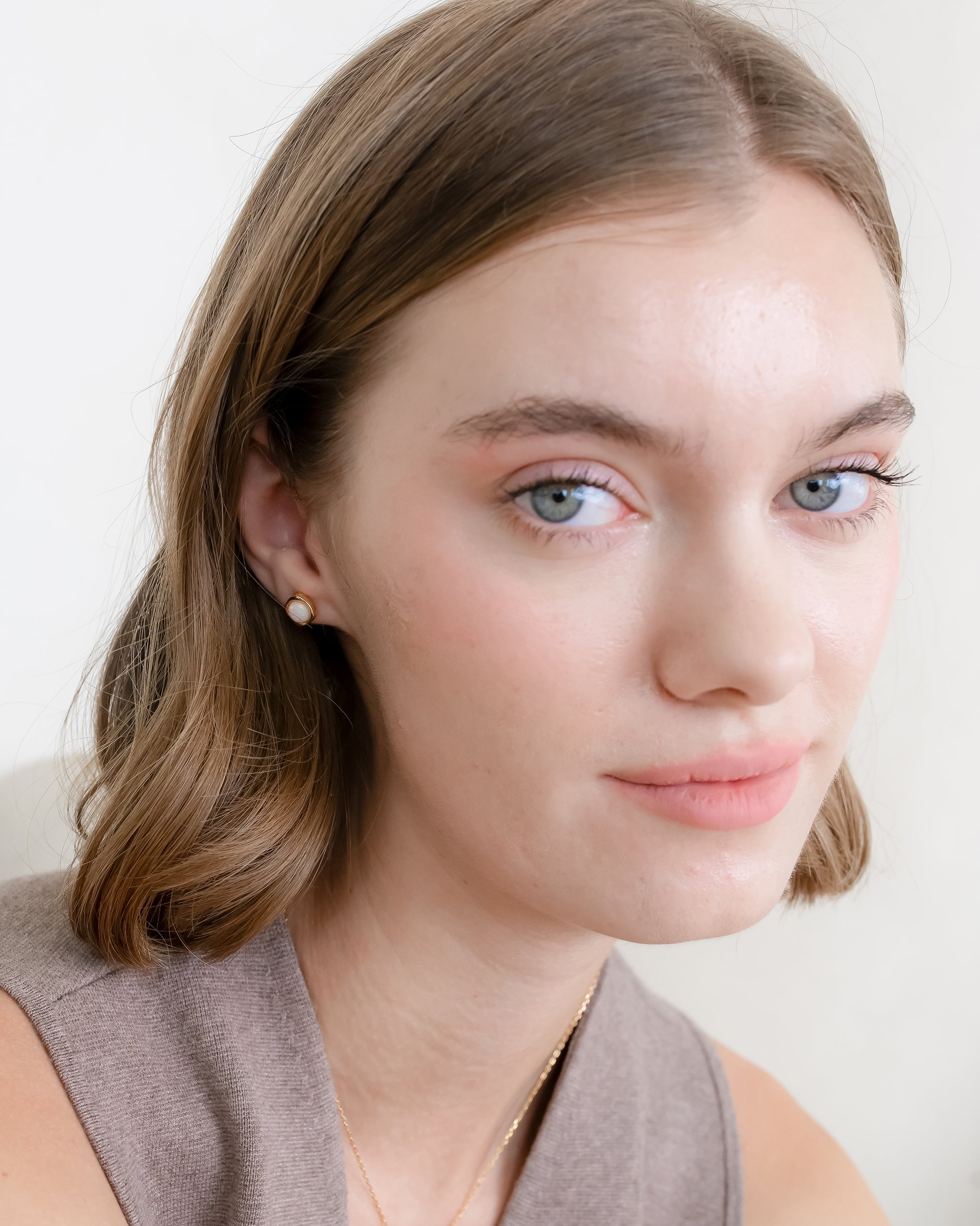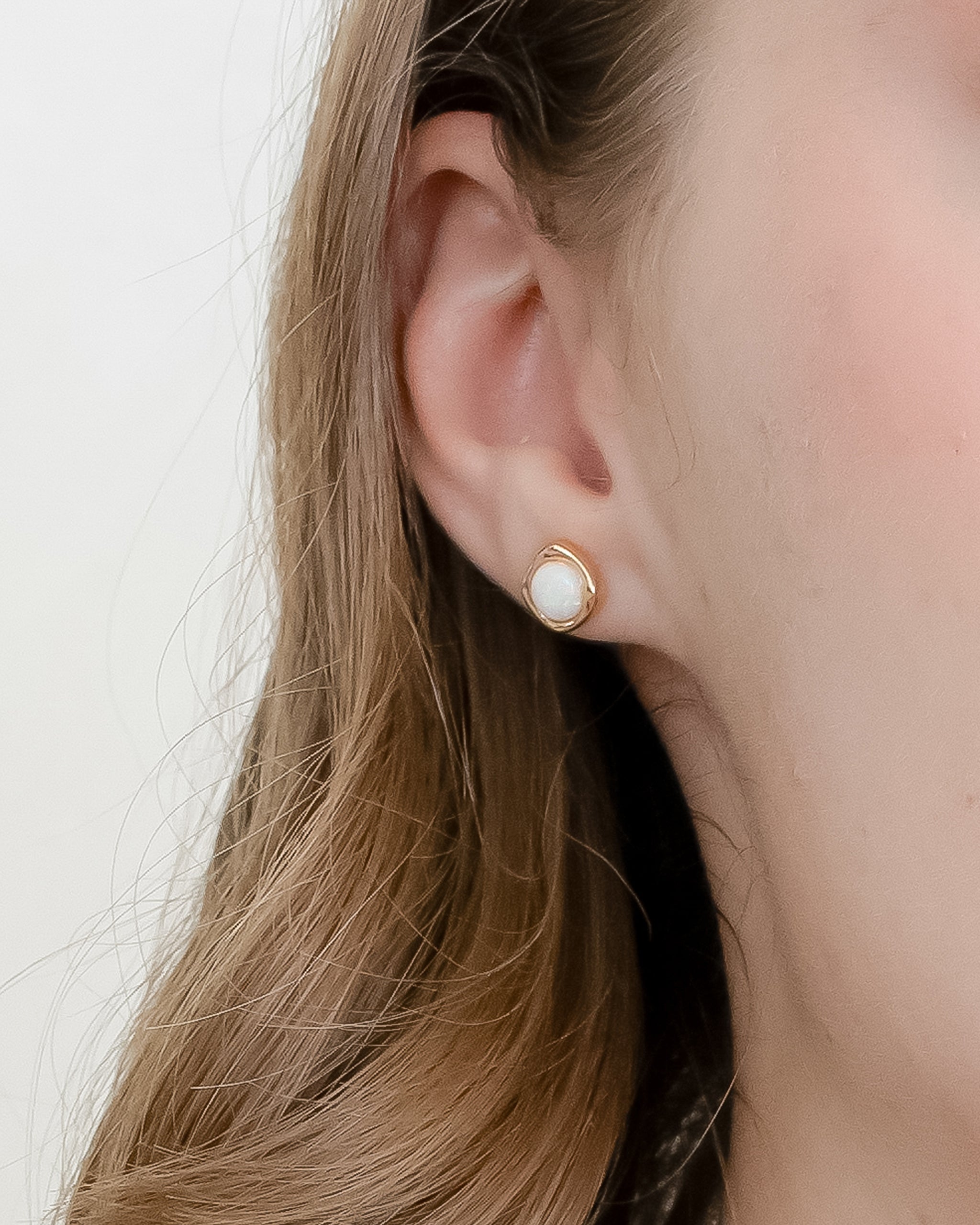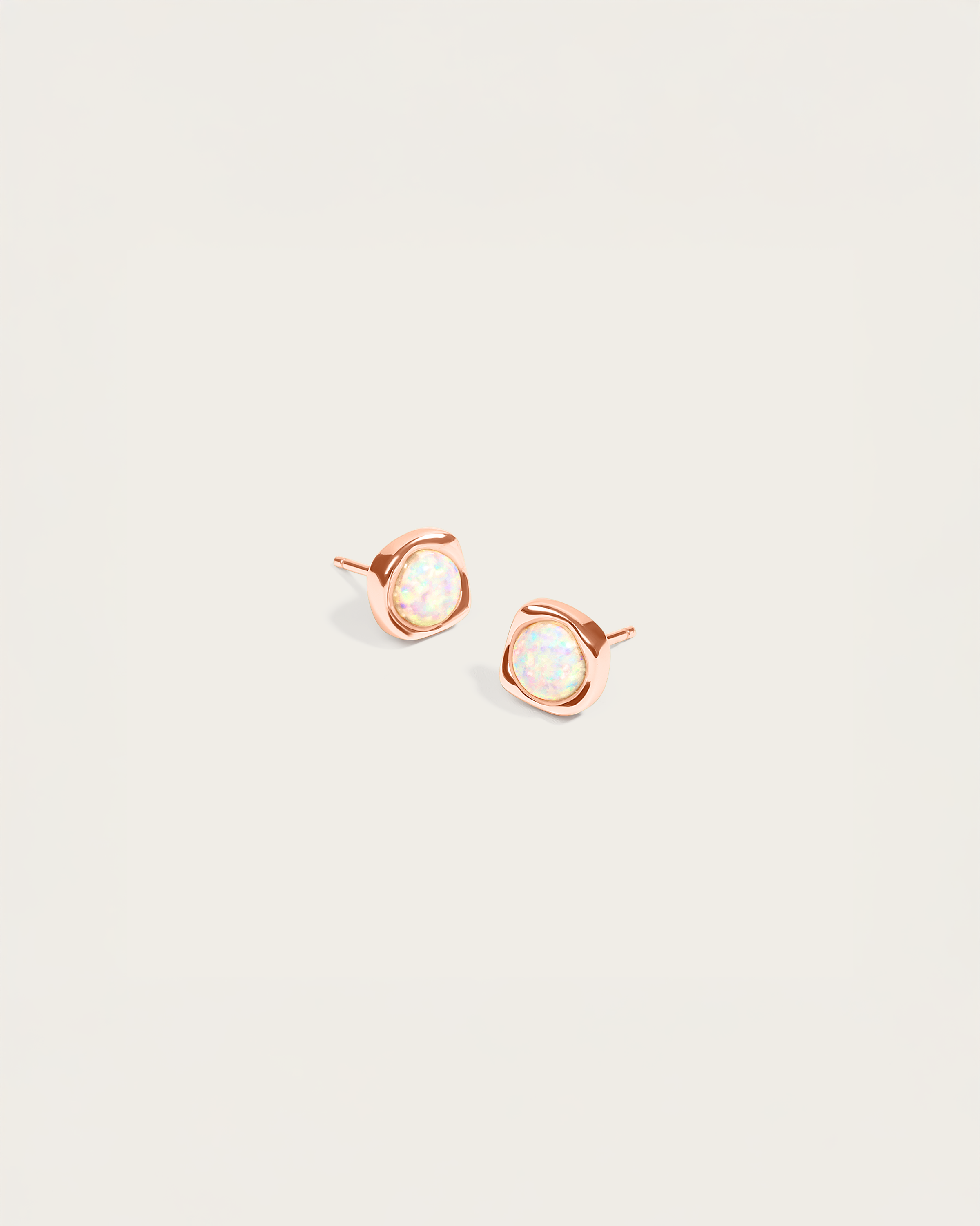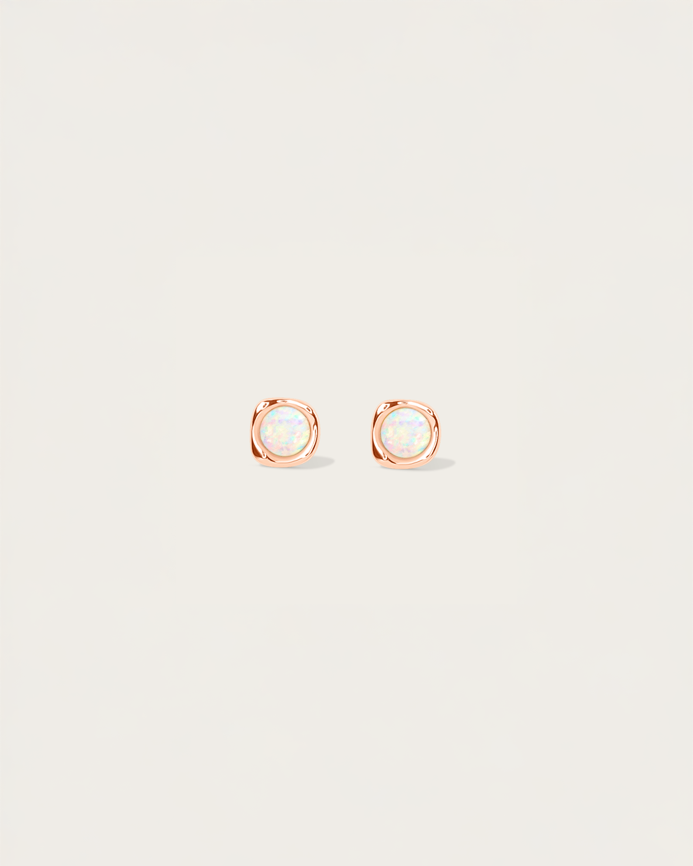 These stud earrings pair lab-grown white opals with softly contoured square settings in rose gold vermeil. The bezels have organic, hand-formed edges that give a natural, sculpted quality.