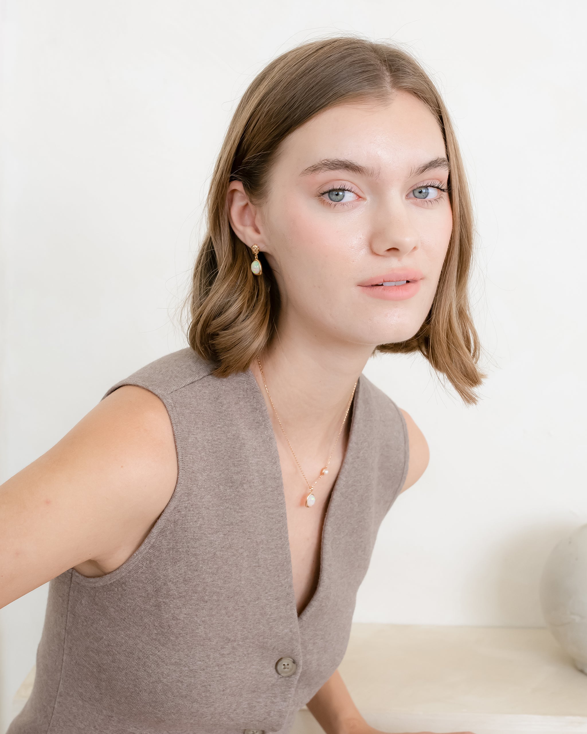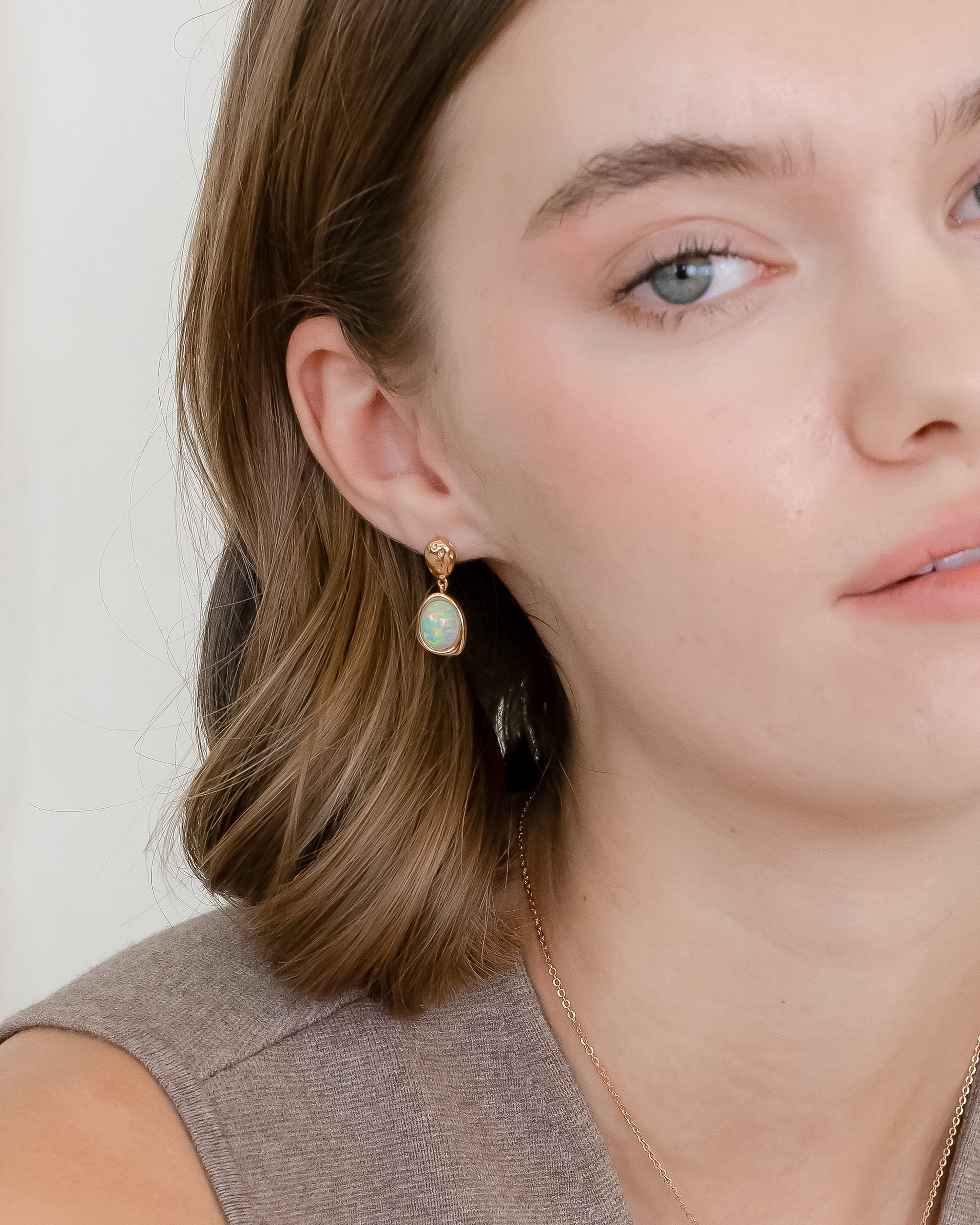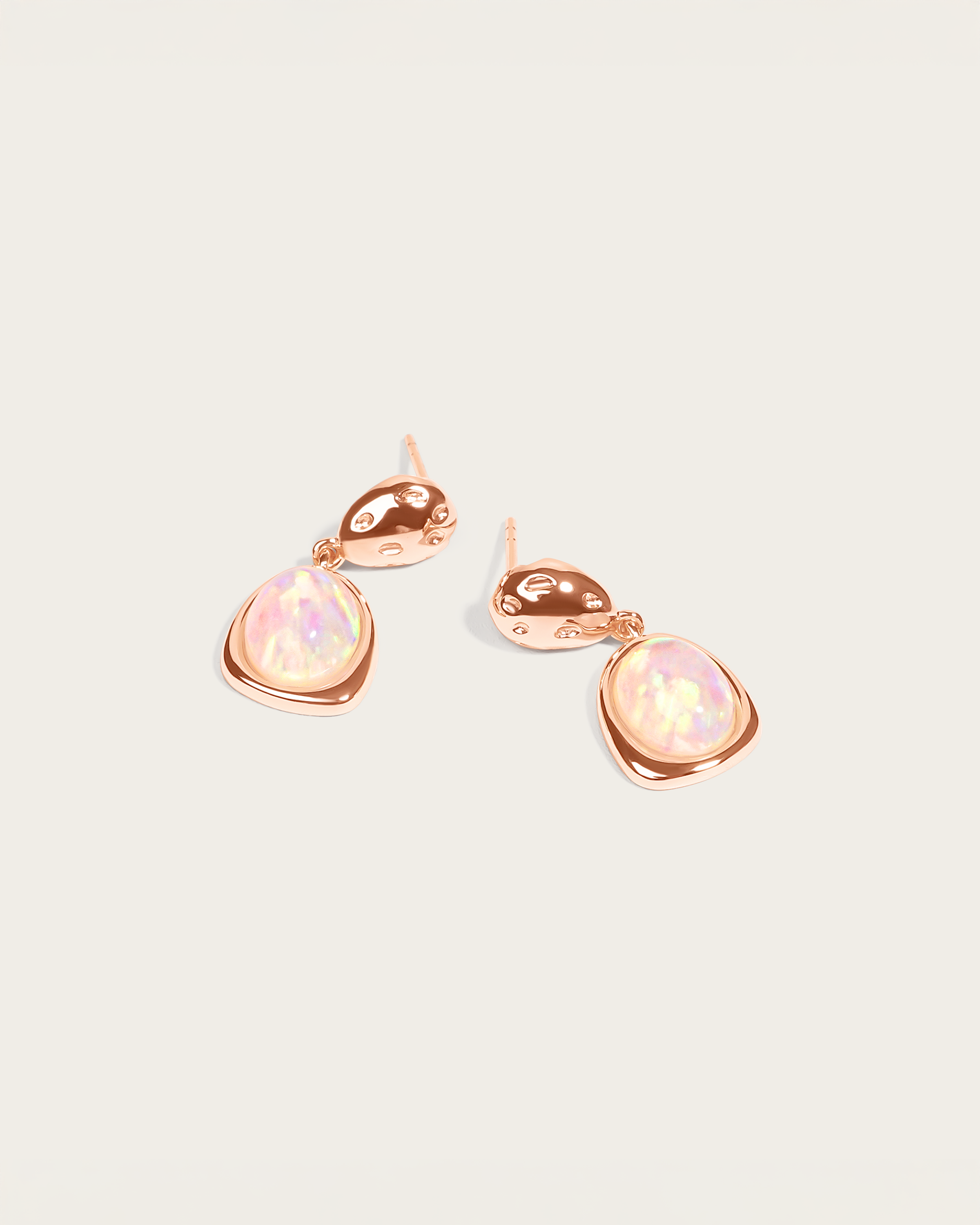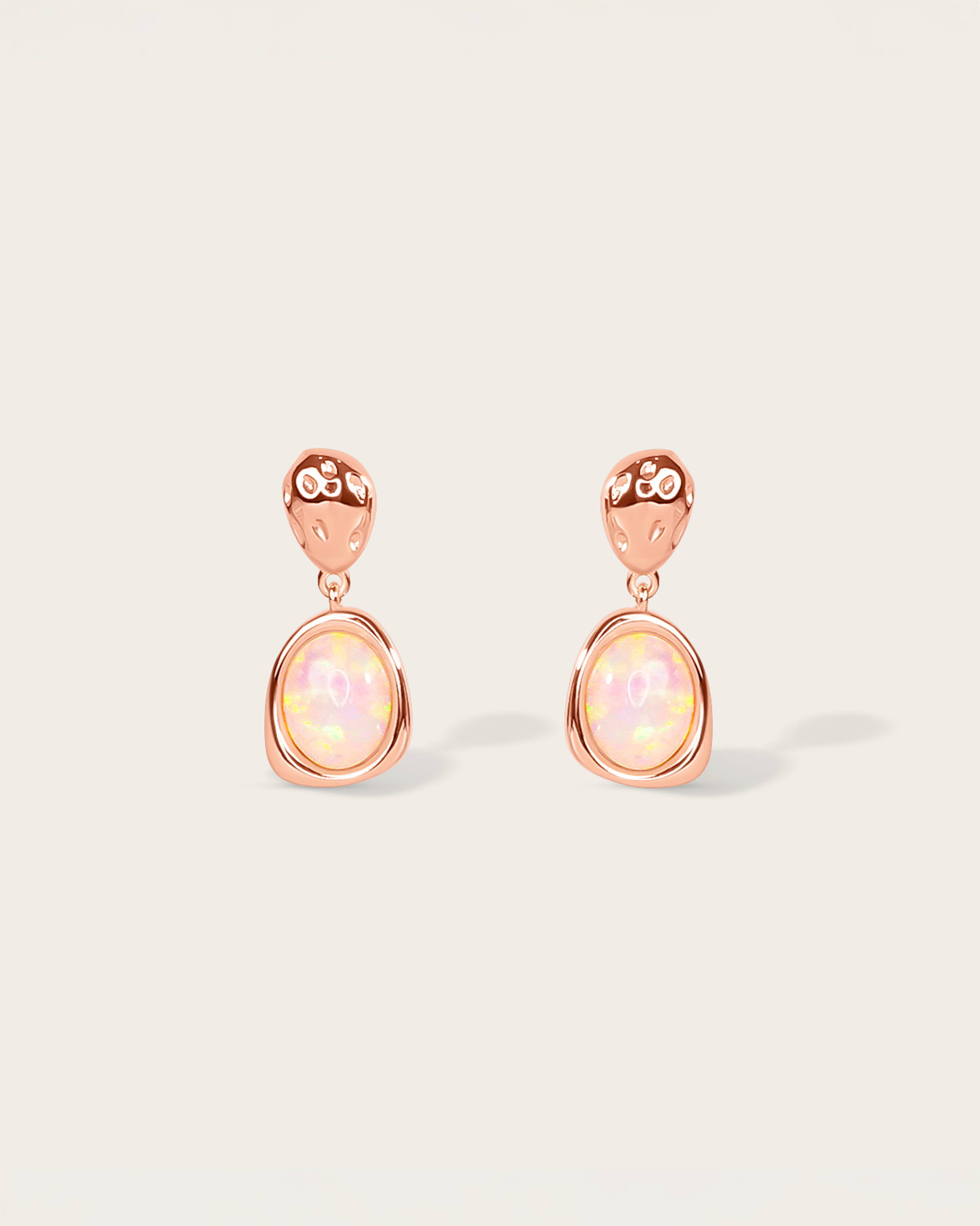 These drop earrings combine lab-grown white opals with organically shaped rose gold vermeil forms. Each opal sits in a fluid bezel beneath a coral pebble-inspired top, designed to explore the tension between smooth geometry and organic texture.