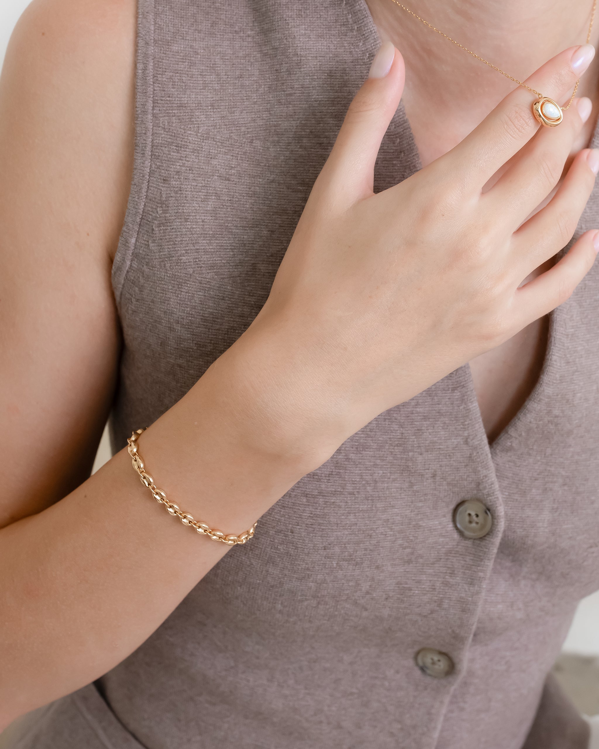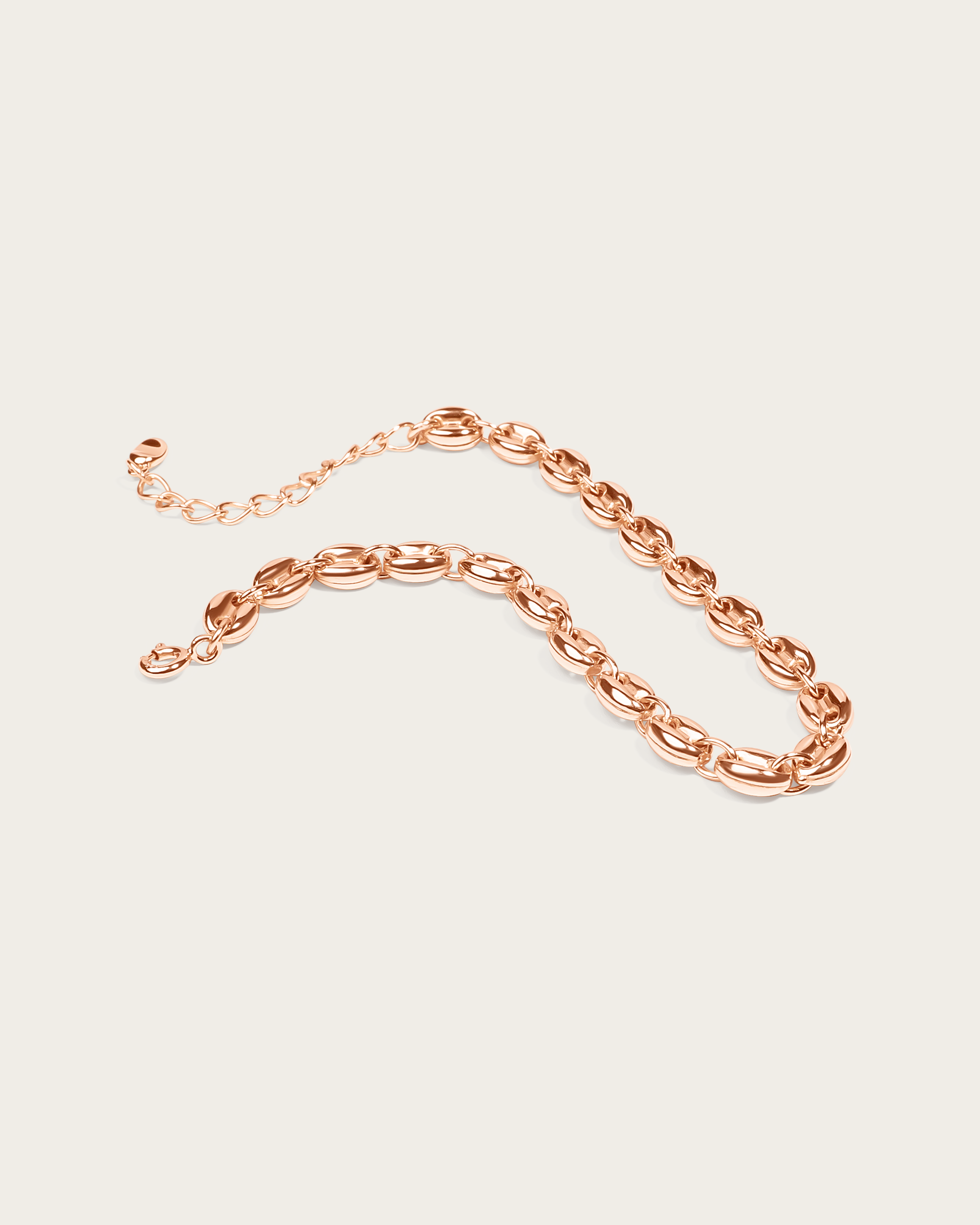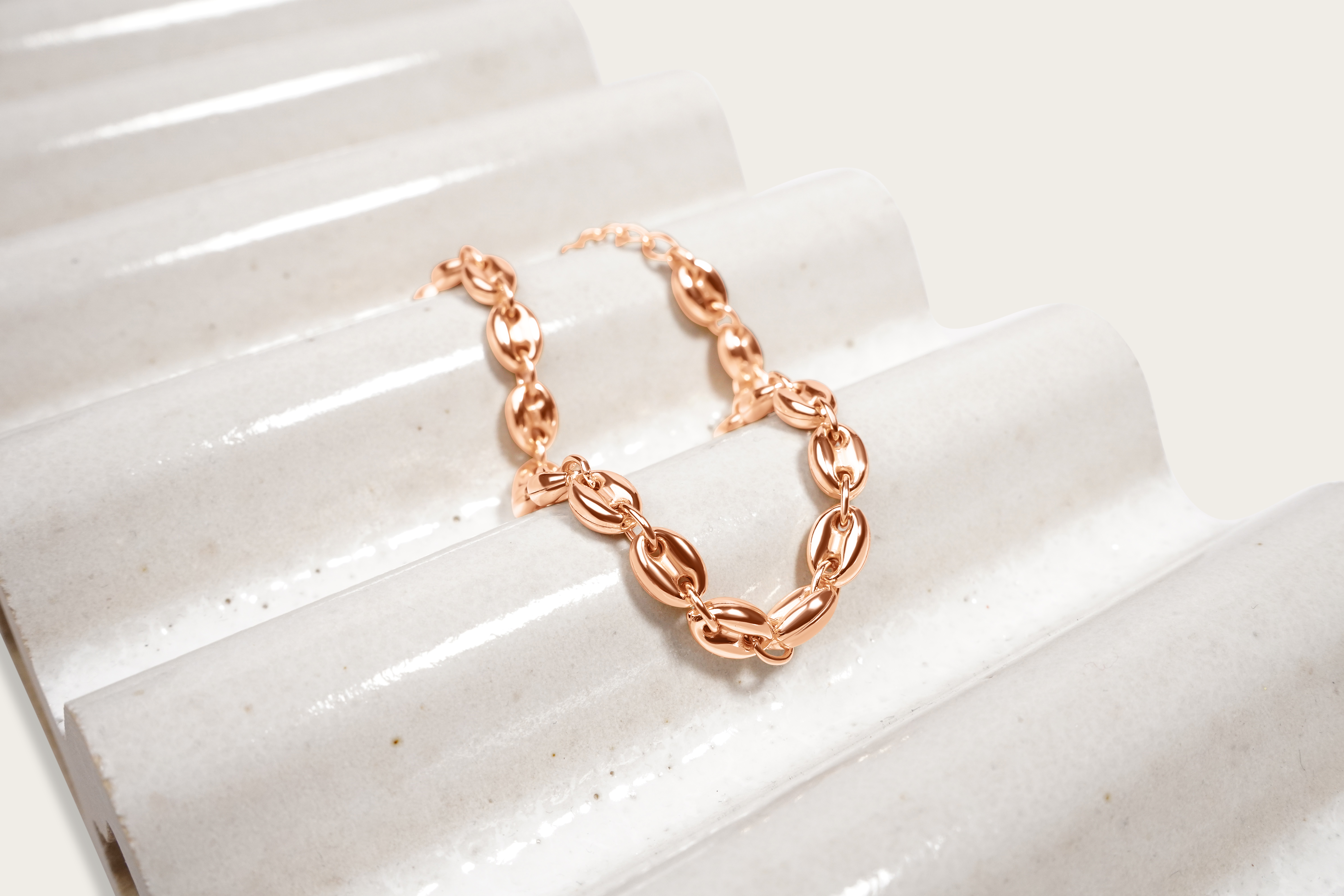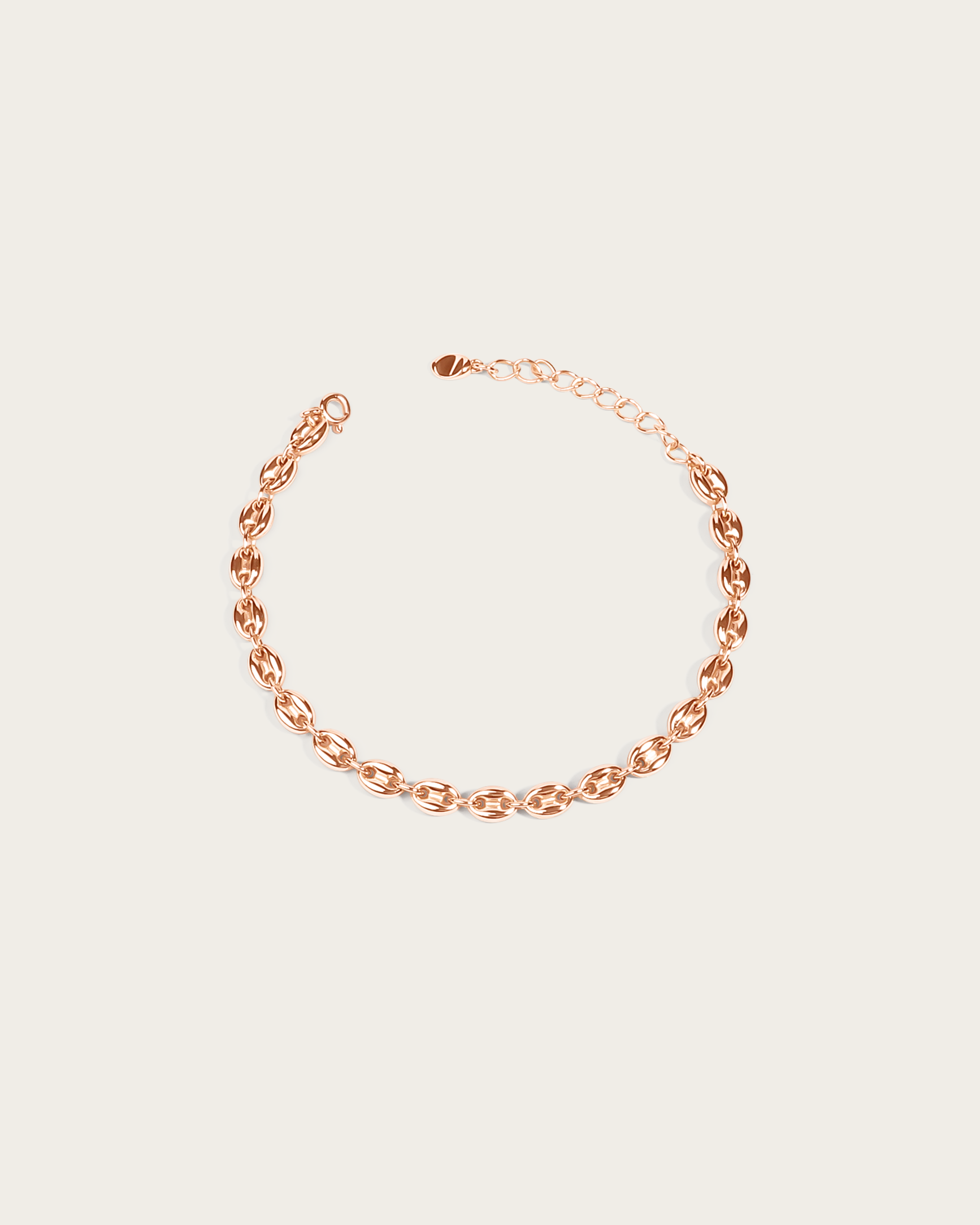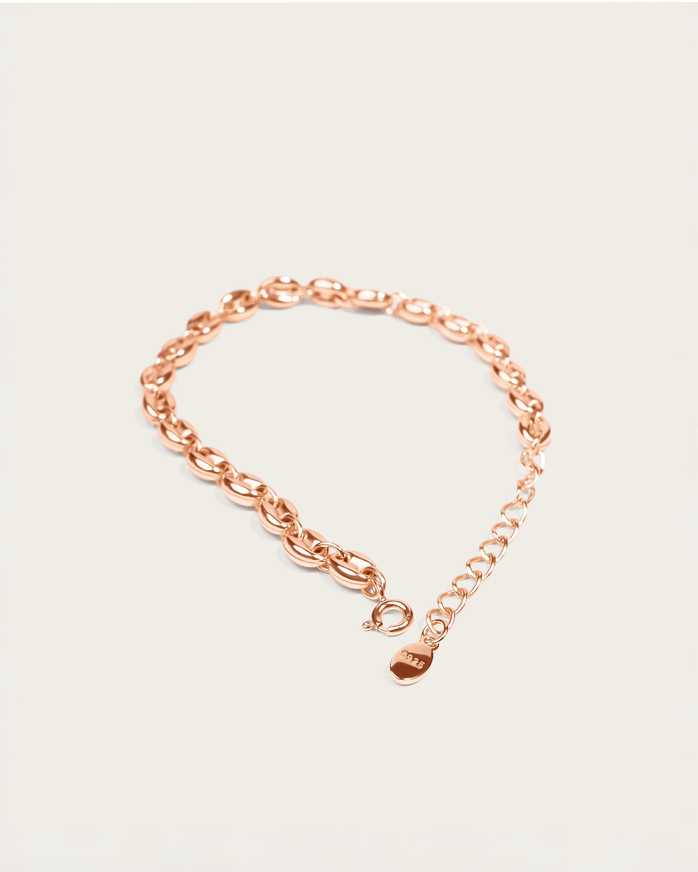 This bracelet uses a sequence of small, coffee-bean–shaped links in rose gold vermeil. Each link has been rounded and slightly compressed to create a continuous, tactile rhythm along the chain.