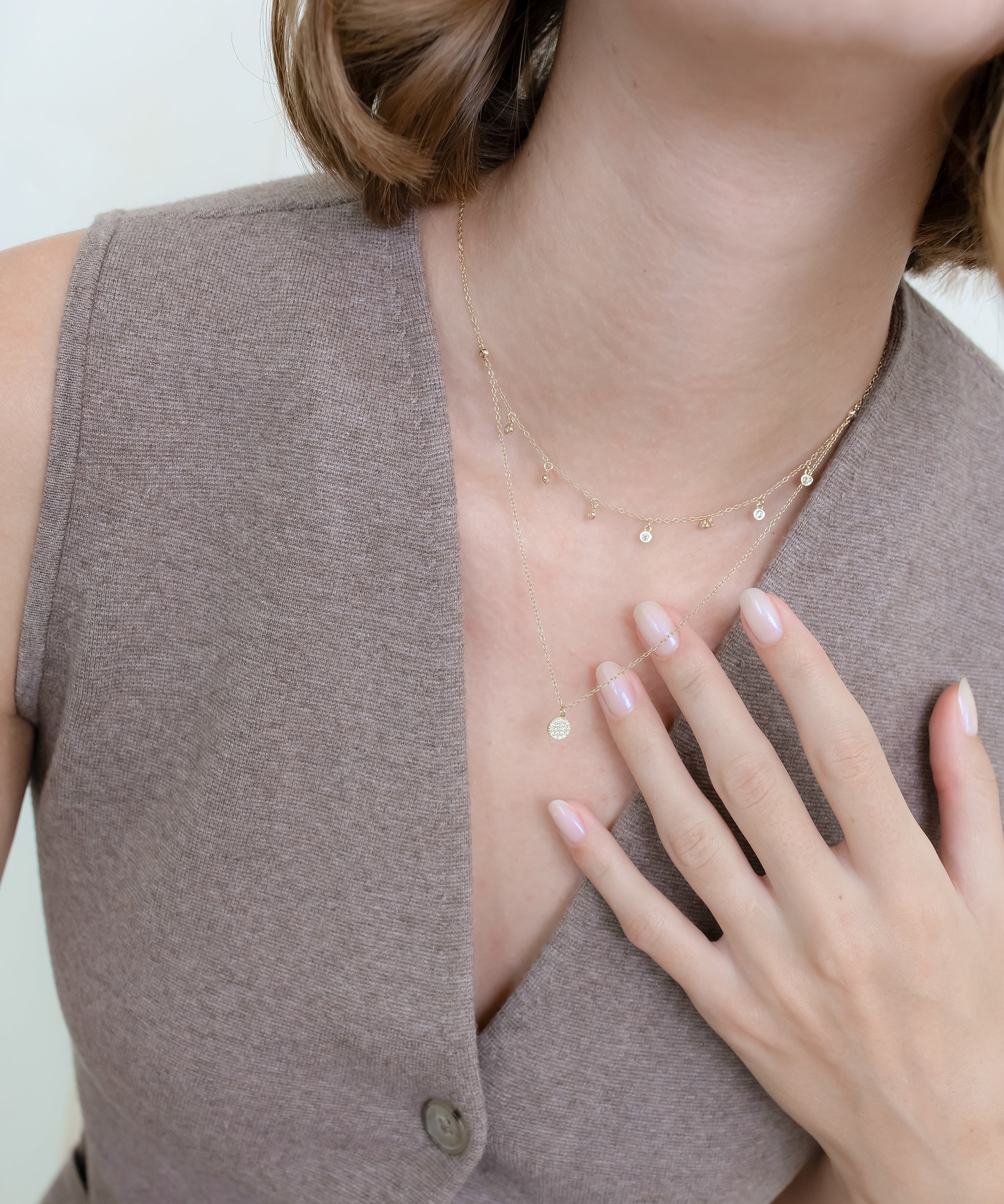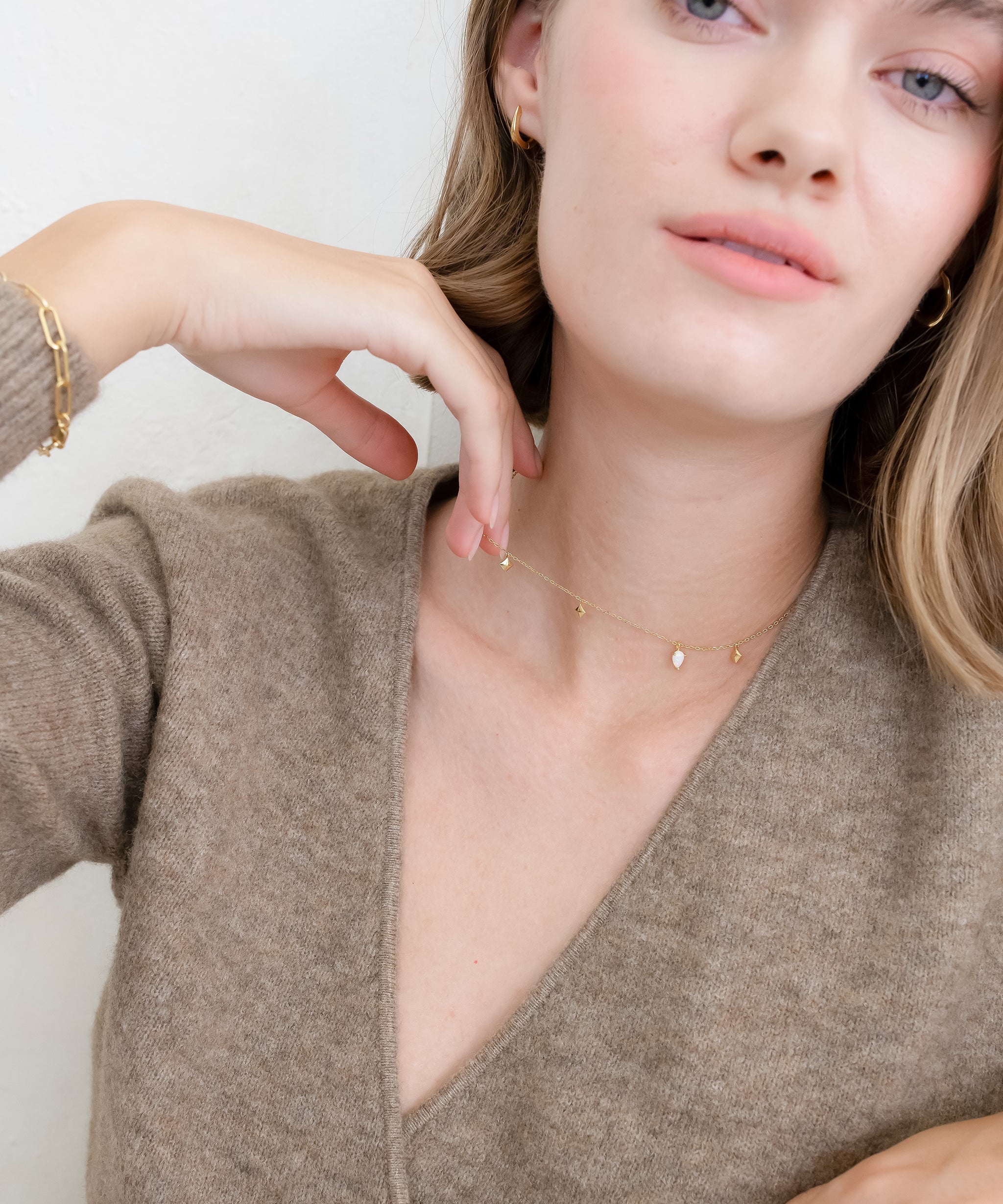 When selecting your necklace, consider both length and layering: start with a choker or short chain close to the collarbone, then add a mid-length piece to draw the eye, and finish with a longer statement pendant for impact. Our collection supports both singular wear and stacking combinations. Rose-gold and vermeil tones pair beautifully with warm-skin undertones and rich fabrics, while gemstones like aquamarine and labradorite add a subtle splash of color without overpowering the aesthetic.