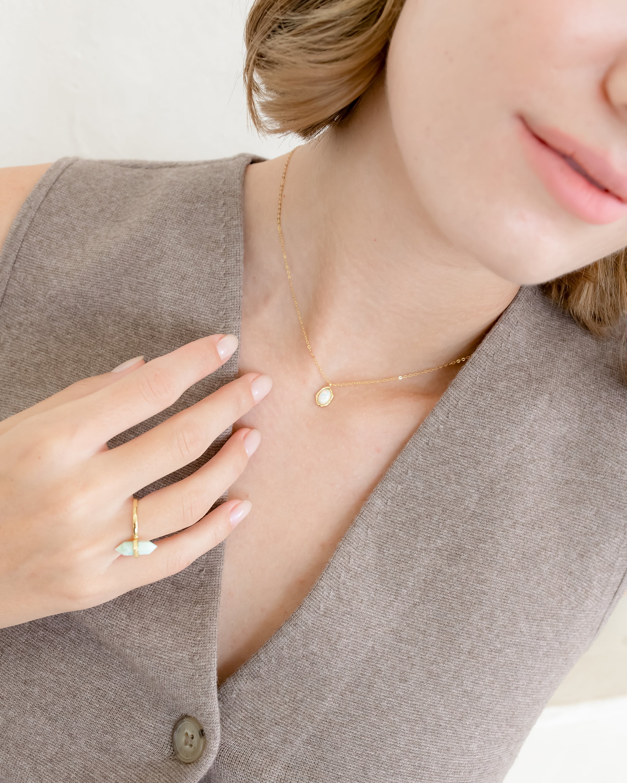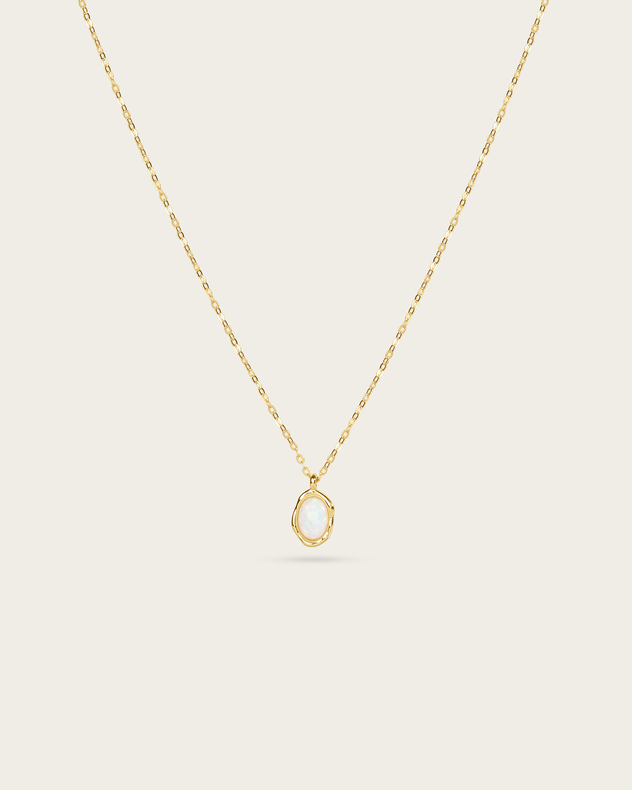 A lab-grown white opal set in a slim gold vermeil frame, suspended from a delicate cable chain. The design combines the opal’s soft, milky surface with the fluid geometry of gold. Simple, balanced, and built around material harmony.
