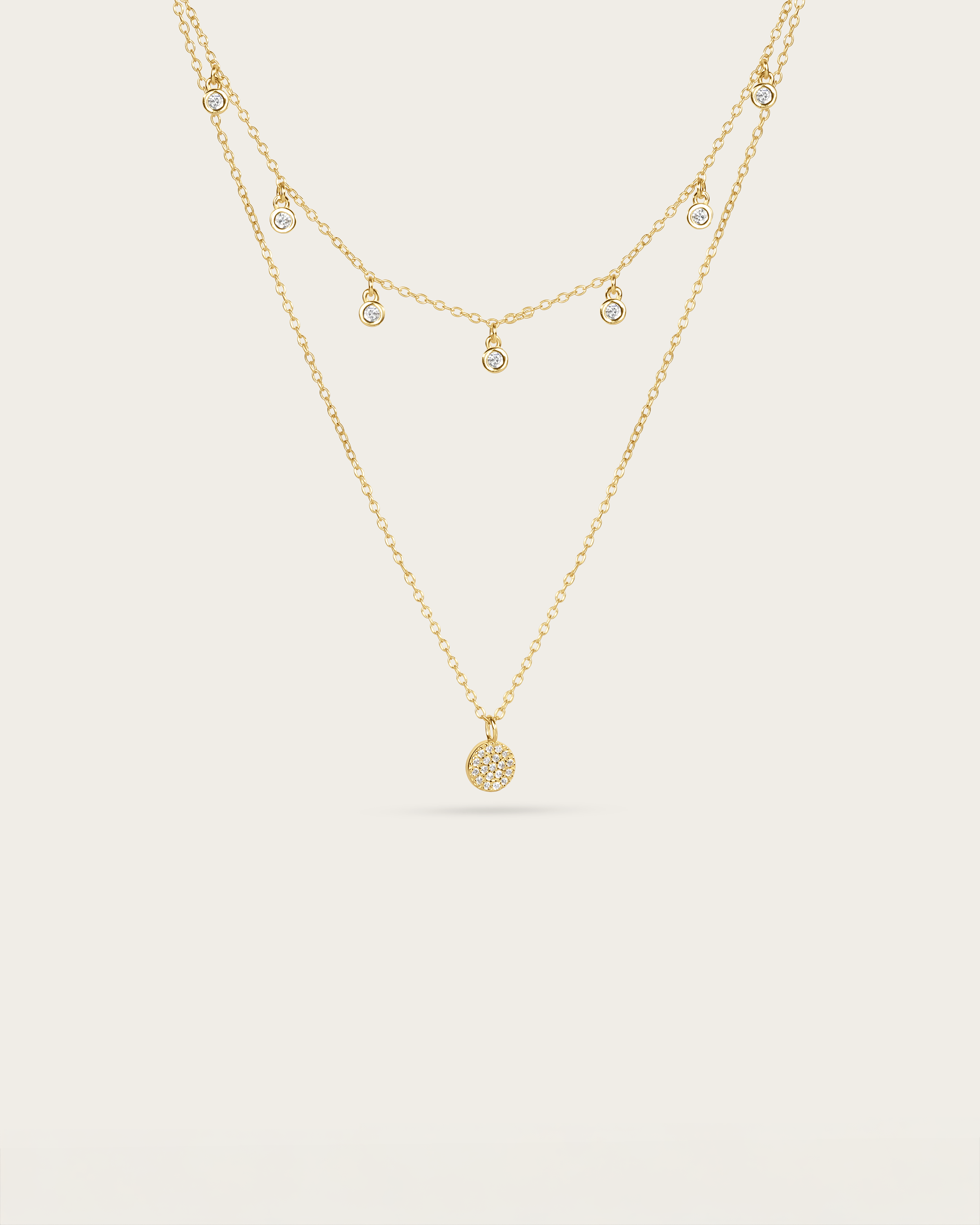 A two-layer necklace in gold vermeil combining structured repetition with subtle movement. The upper chain holds evenly spaced cubic zirconia stations, while the lower layer centers a round pavé-set pendant.