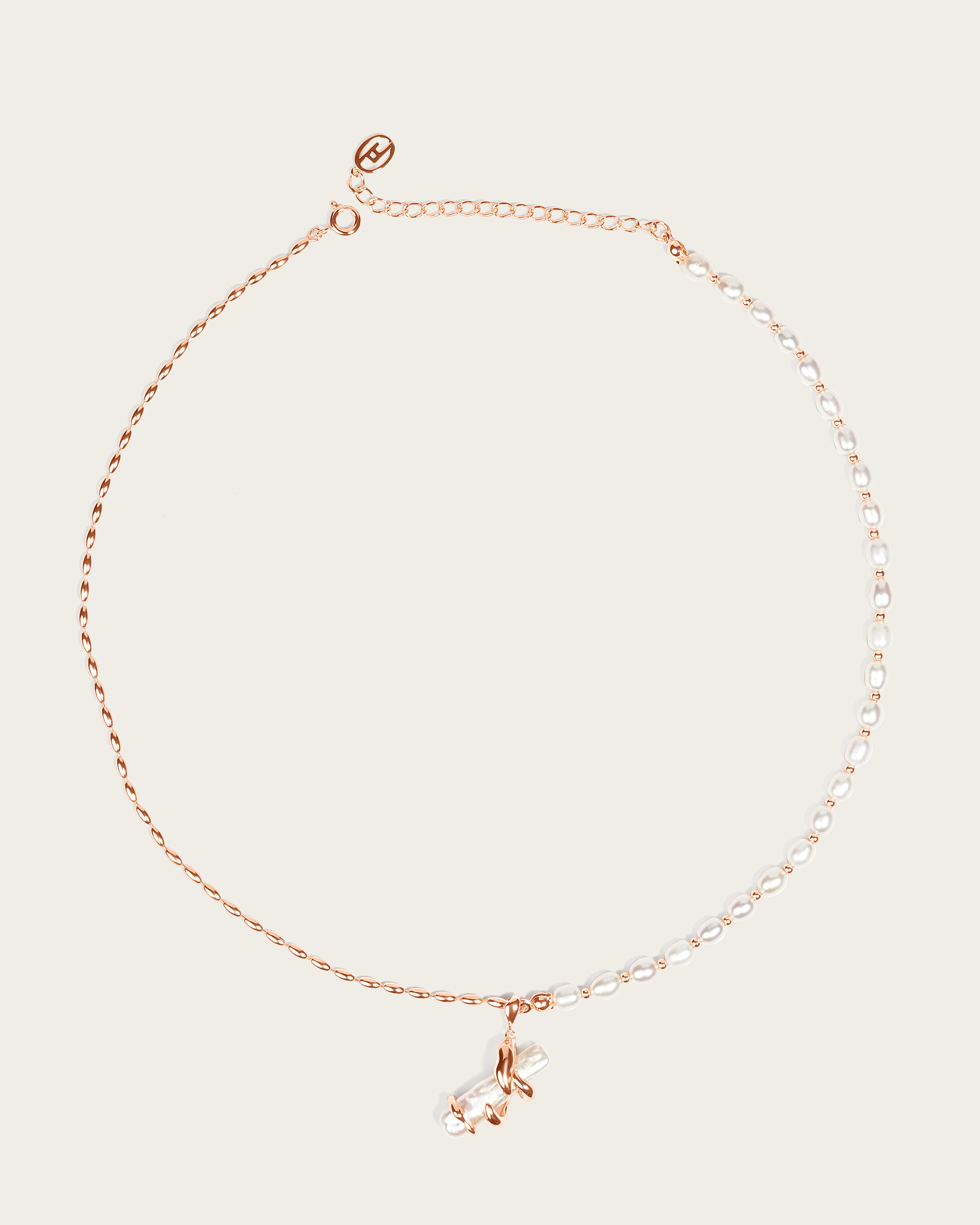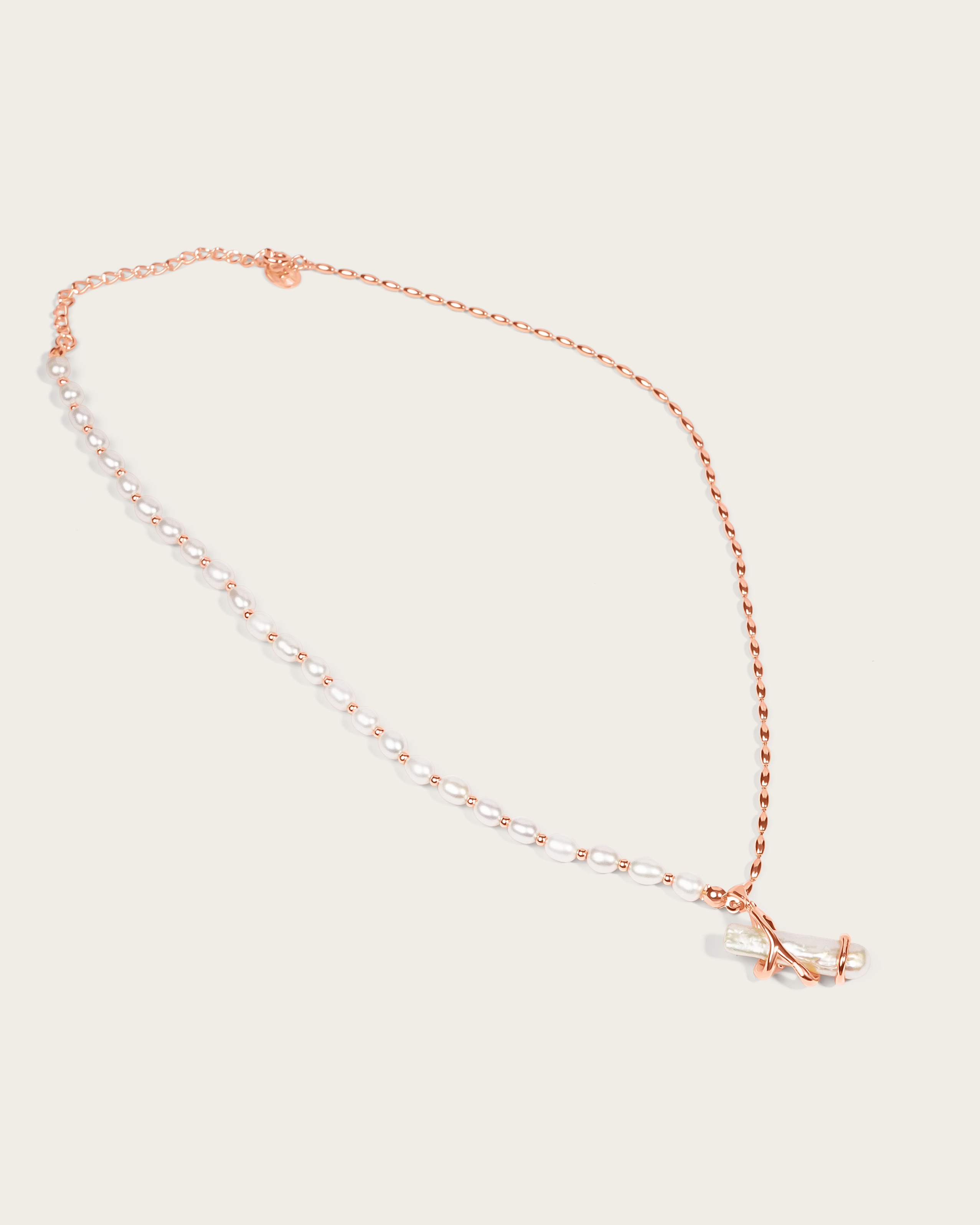 Part of the Flow Collection, this rose gold vermeil necklace features a Biwa pearl pendant wrapped in an organic, freeform setting. Its asymmetrical design pairs freshwater pearls on one side with rose gold vermeil beads on the other. This piece is a fresh interpretation of a classic style that merges balance with subtle edge.