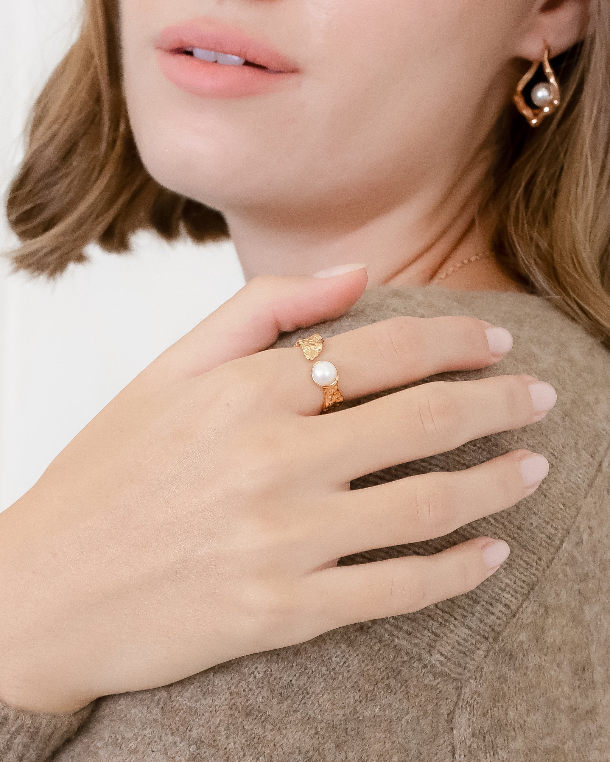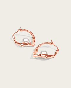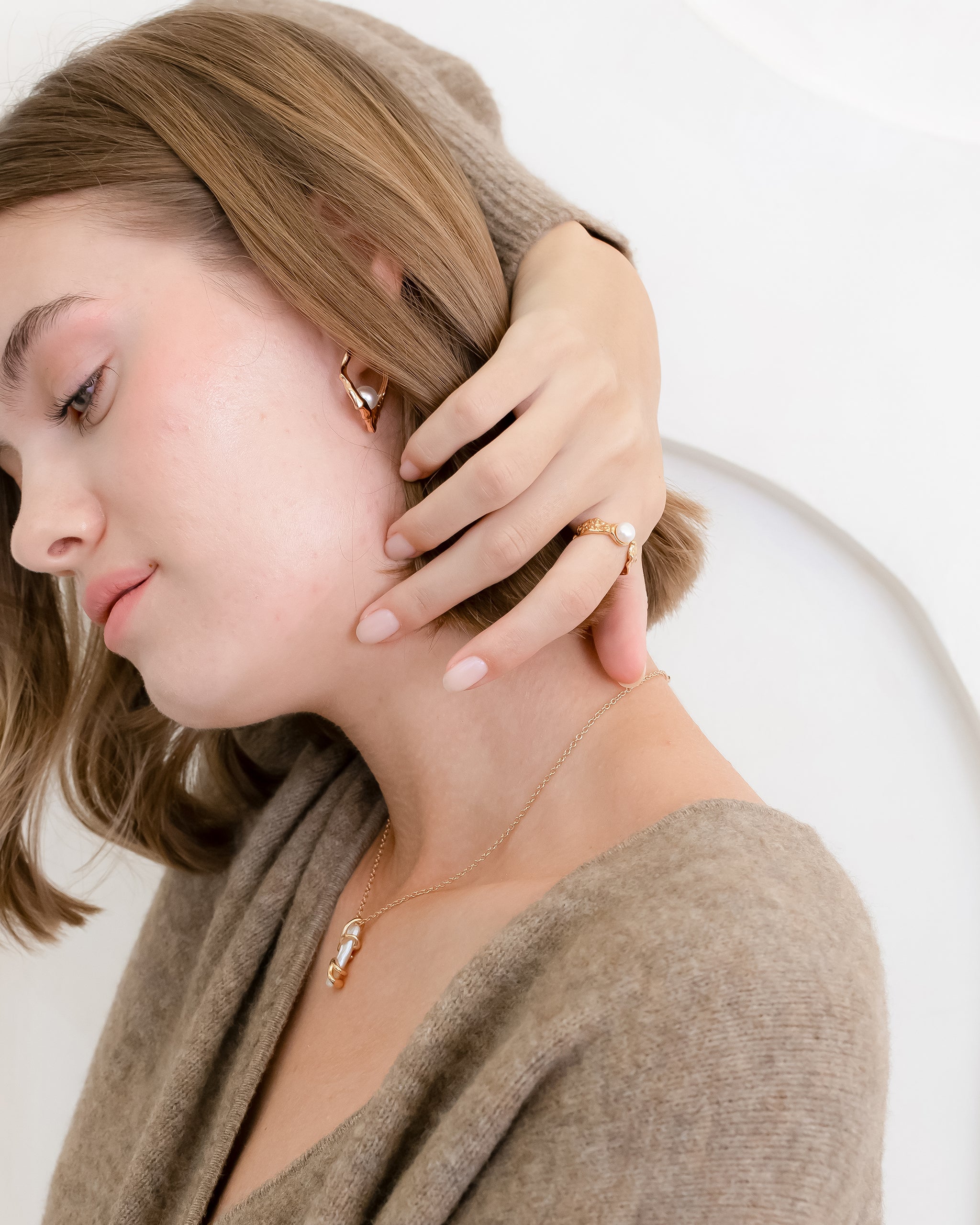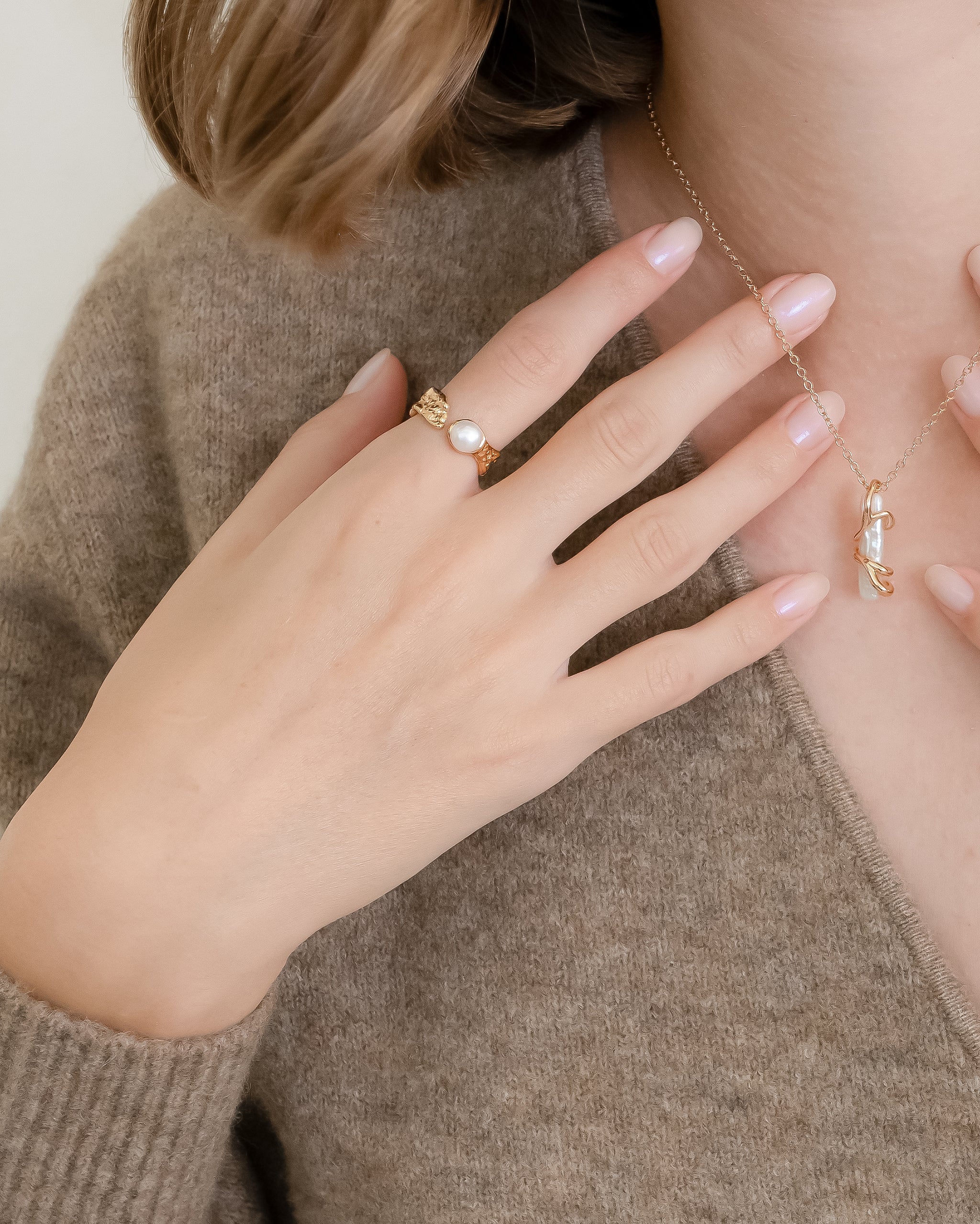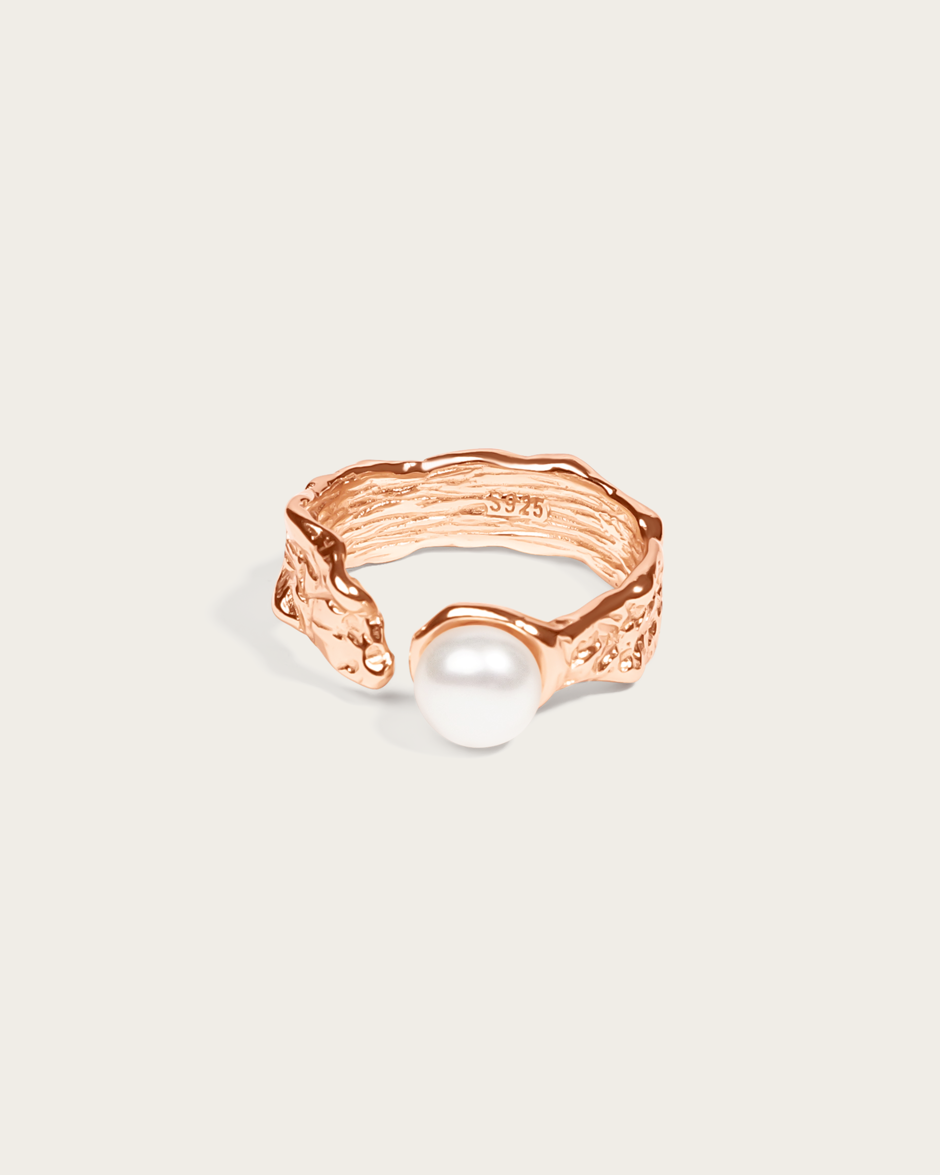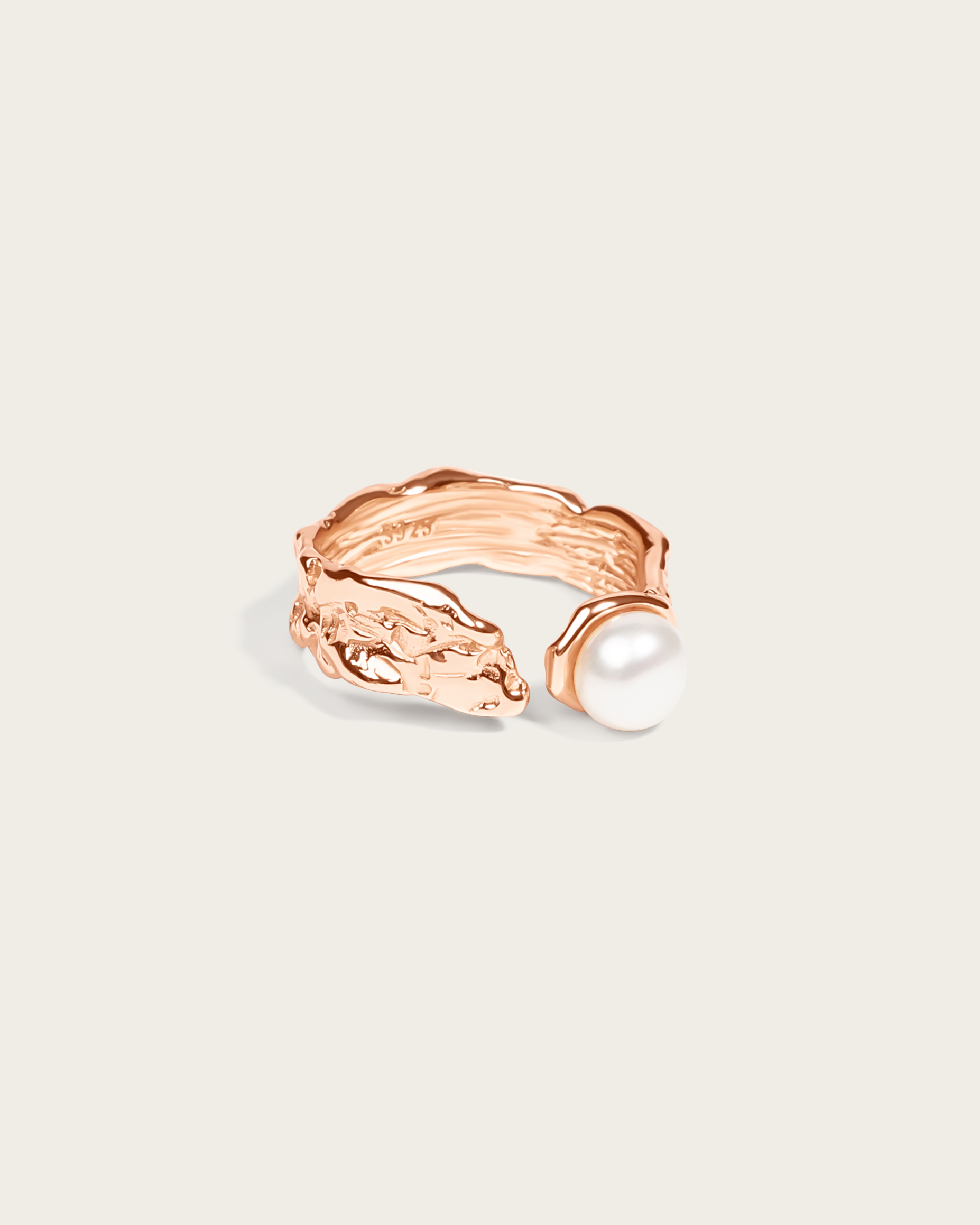 A sculptural cuff ring featuring a freshwater pearl set within a fluid, rippled band. Made from rose gold vermeil over 925 sterling silver, the design draws subtle texture from the movement of water and metal.