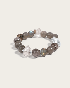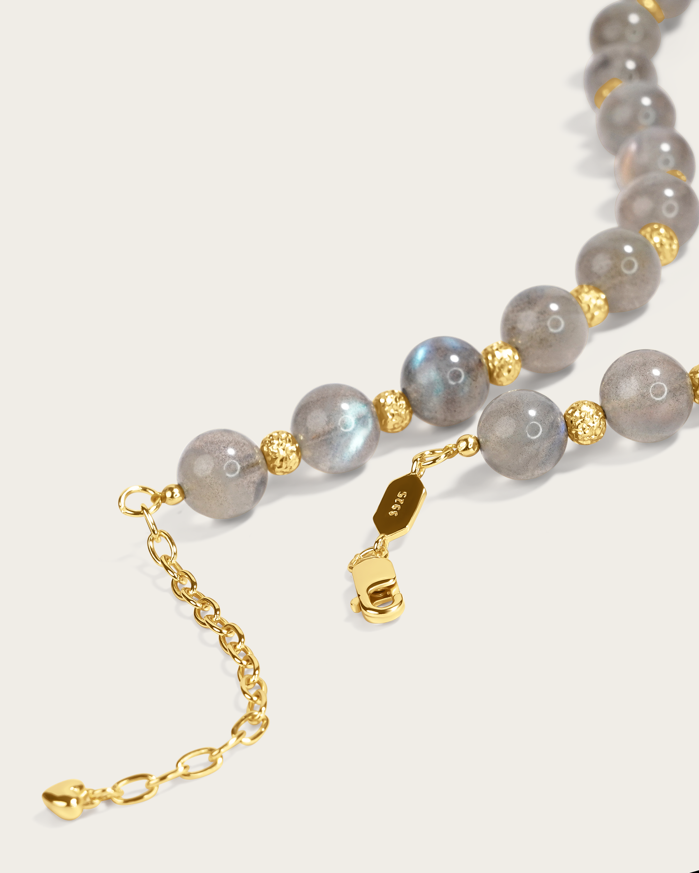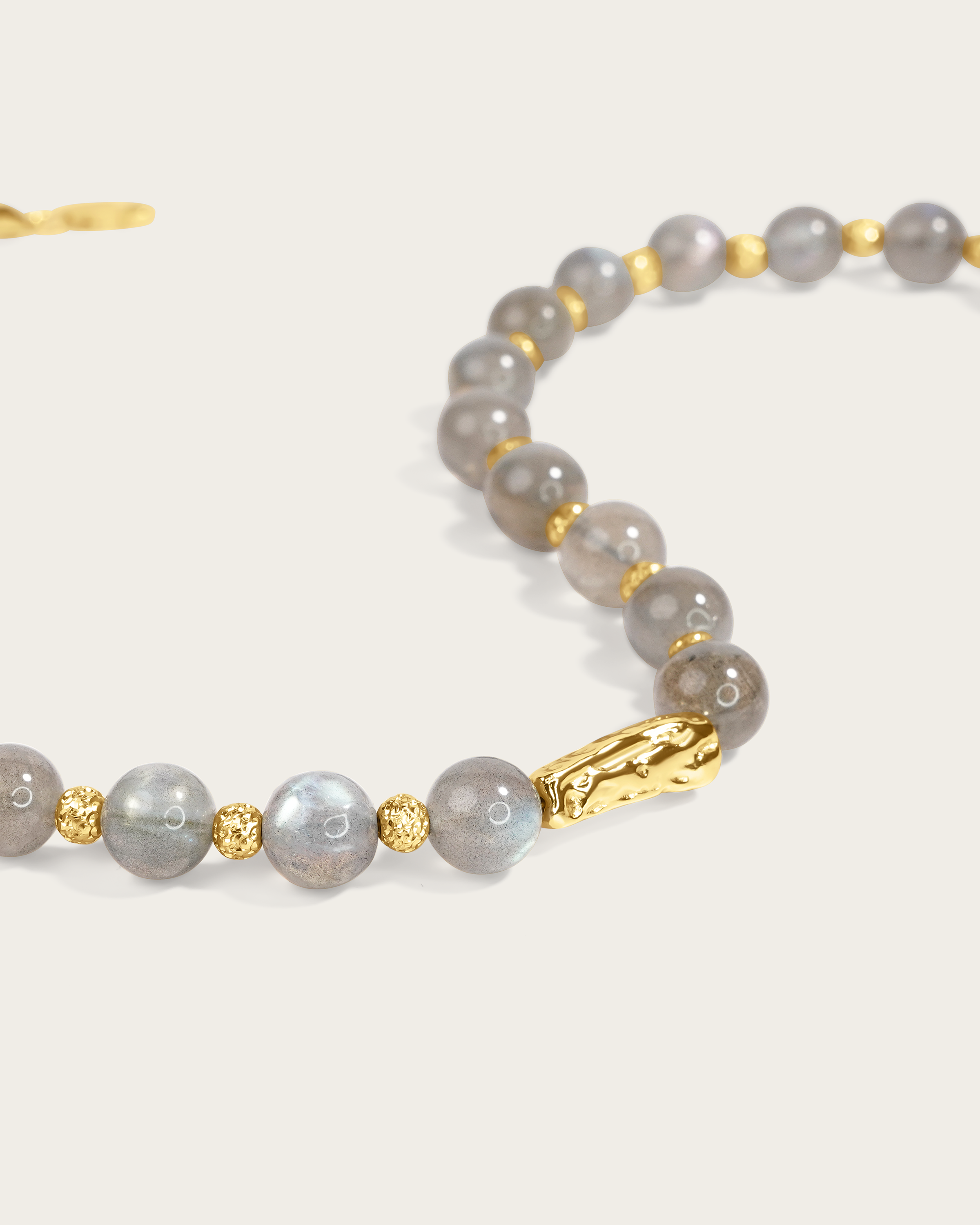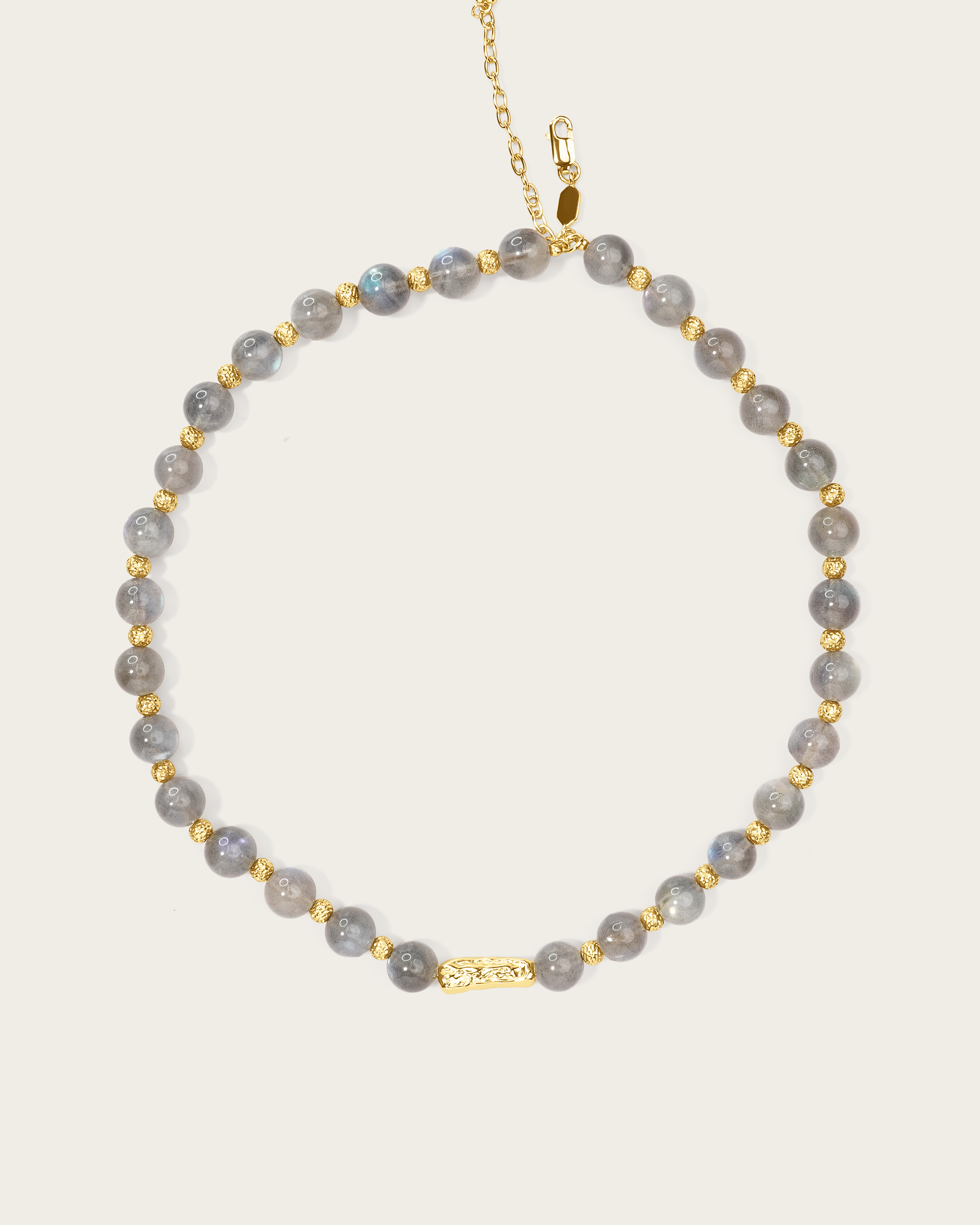 This choker necklace combines labradorite beads with gold vermeil beads and accents, finished with a gold center detail. The stones are strung on a durable gold vermeil cord, adding a warm glow that enhances the labradorite’s natural depth and iridescence. Known for symbolizing intuition and resilience, labradorite brings a quiet strength to this balanced centerpiece
