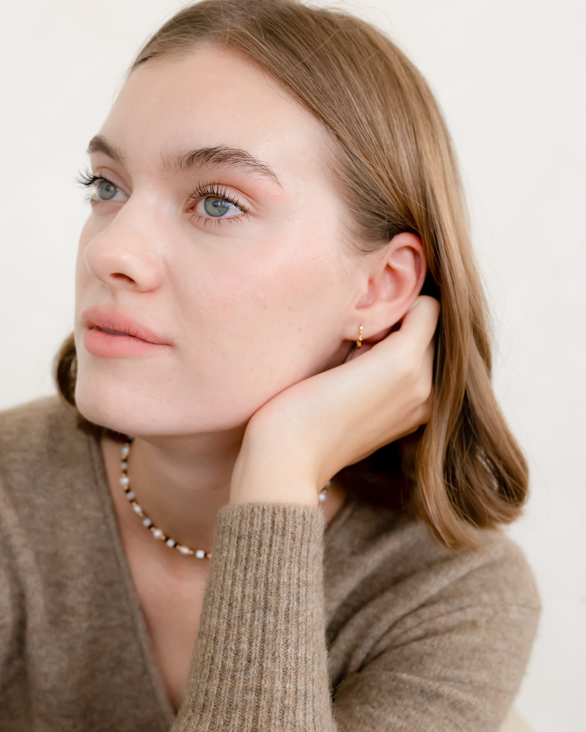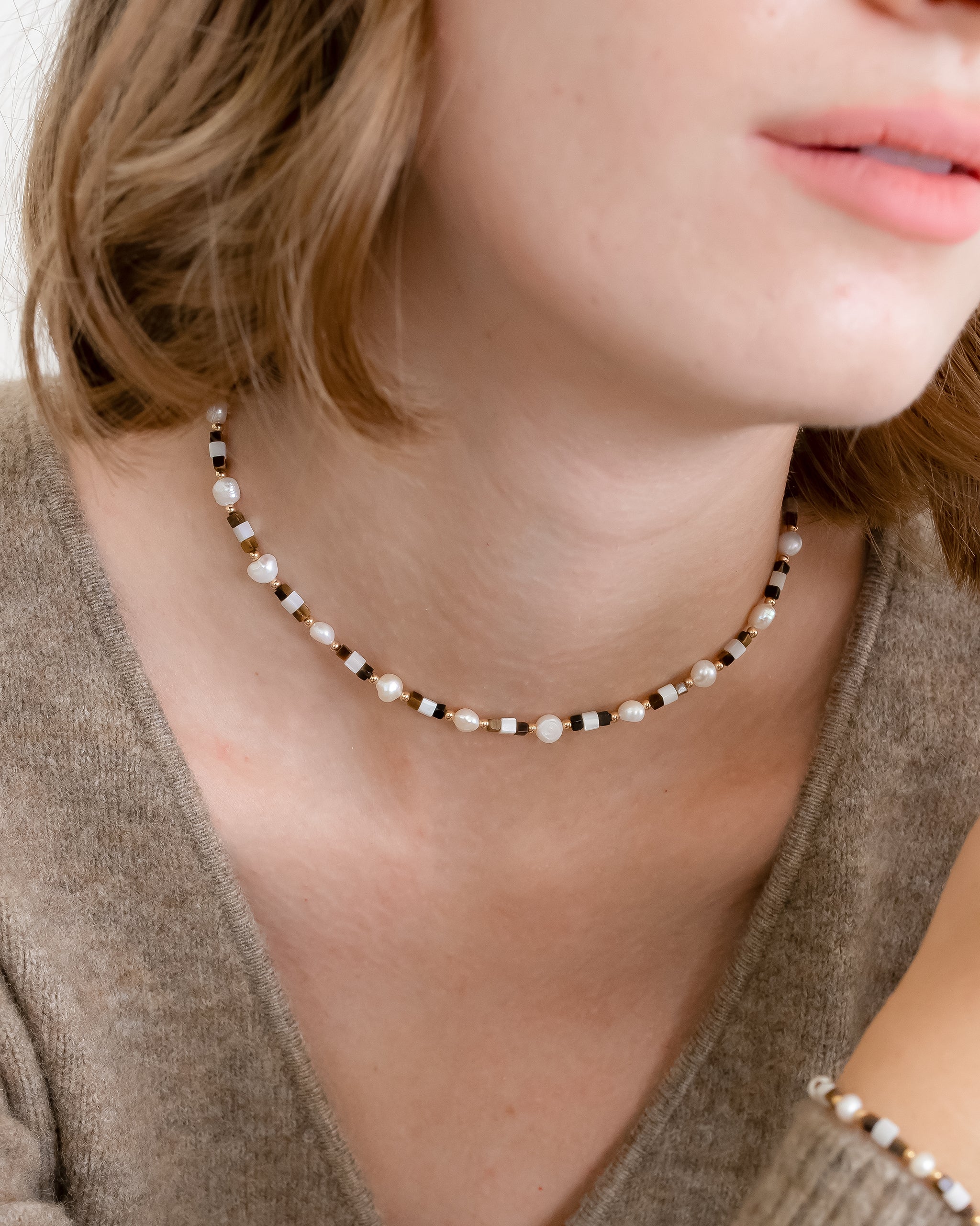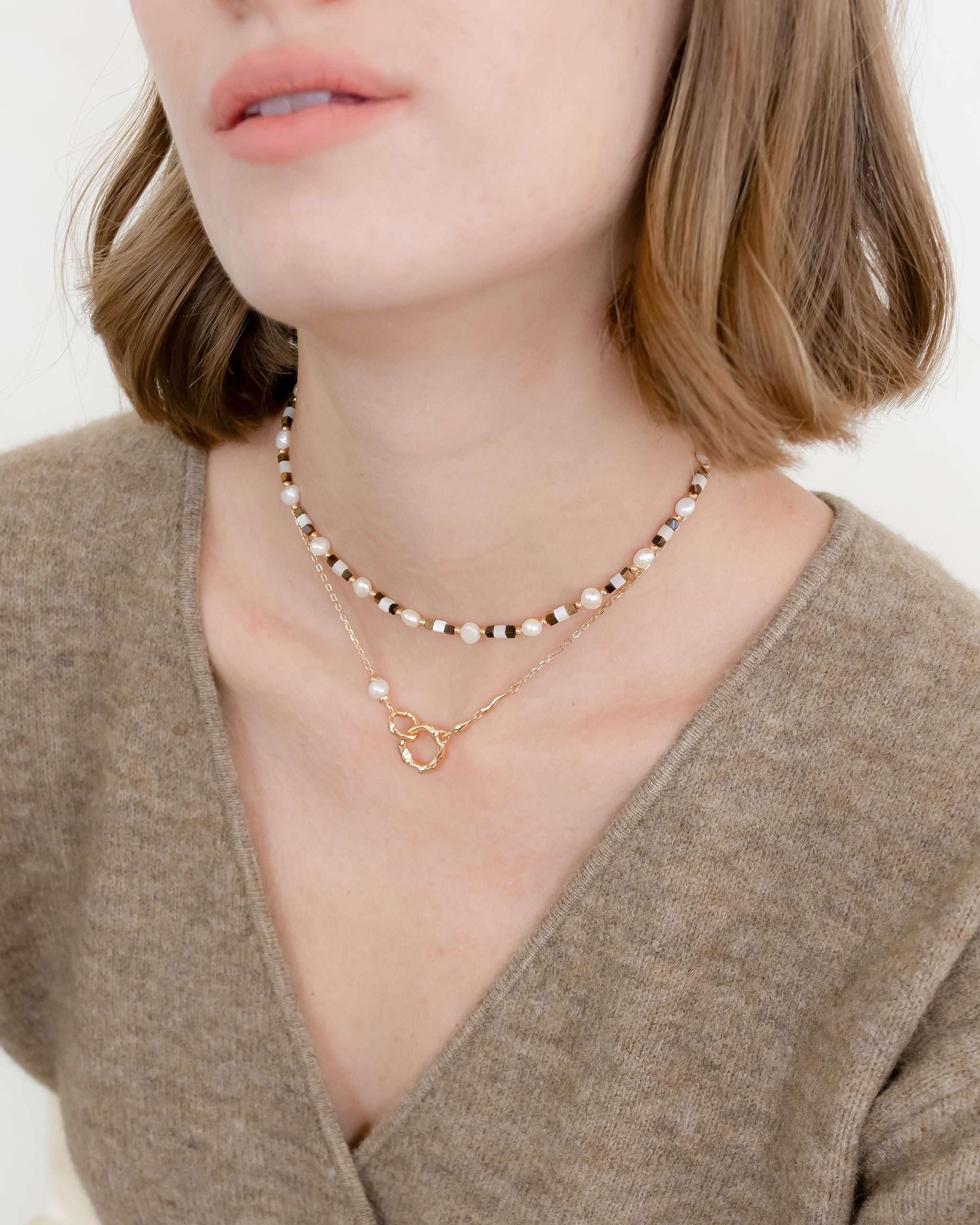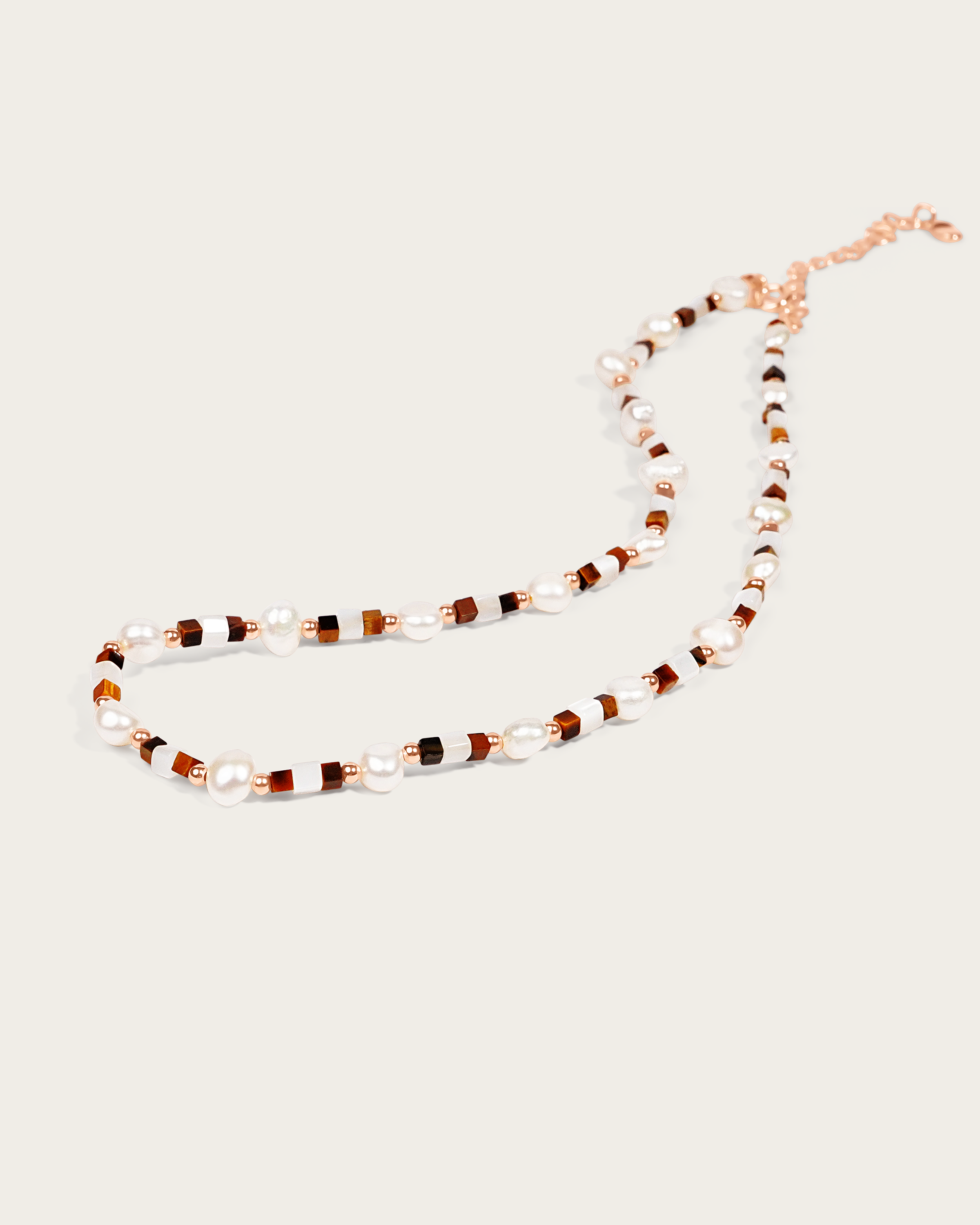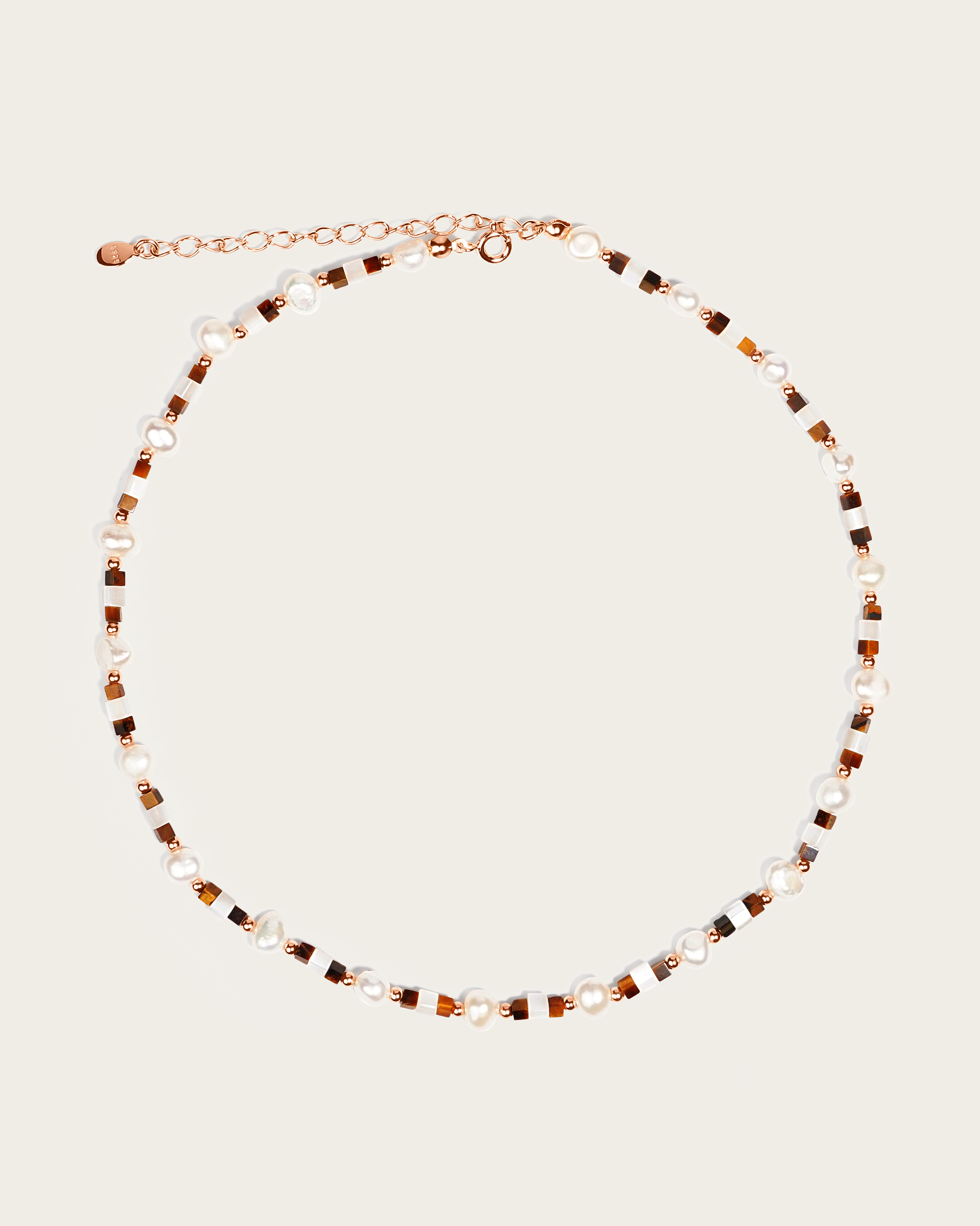 This beaded necklace is thoughtfully designed with a mix of freshwater pearls, tiger’s eye, and mother of pearl beads, accented with rose gold vermeil details. The alternating tones of warm brown, soft white, and lustrous gold create a delicate piece that's easy to wear on its own or as the finishing layer at the top of a necklace stack.